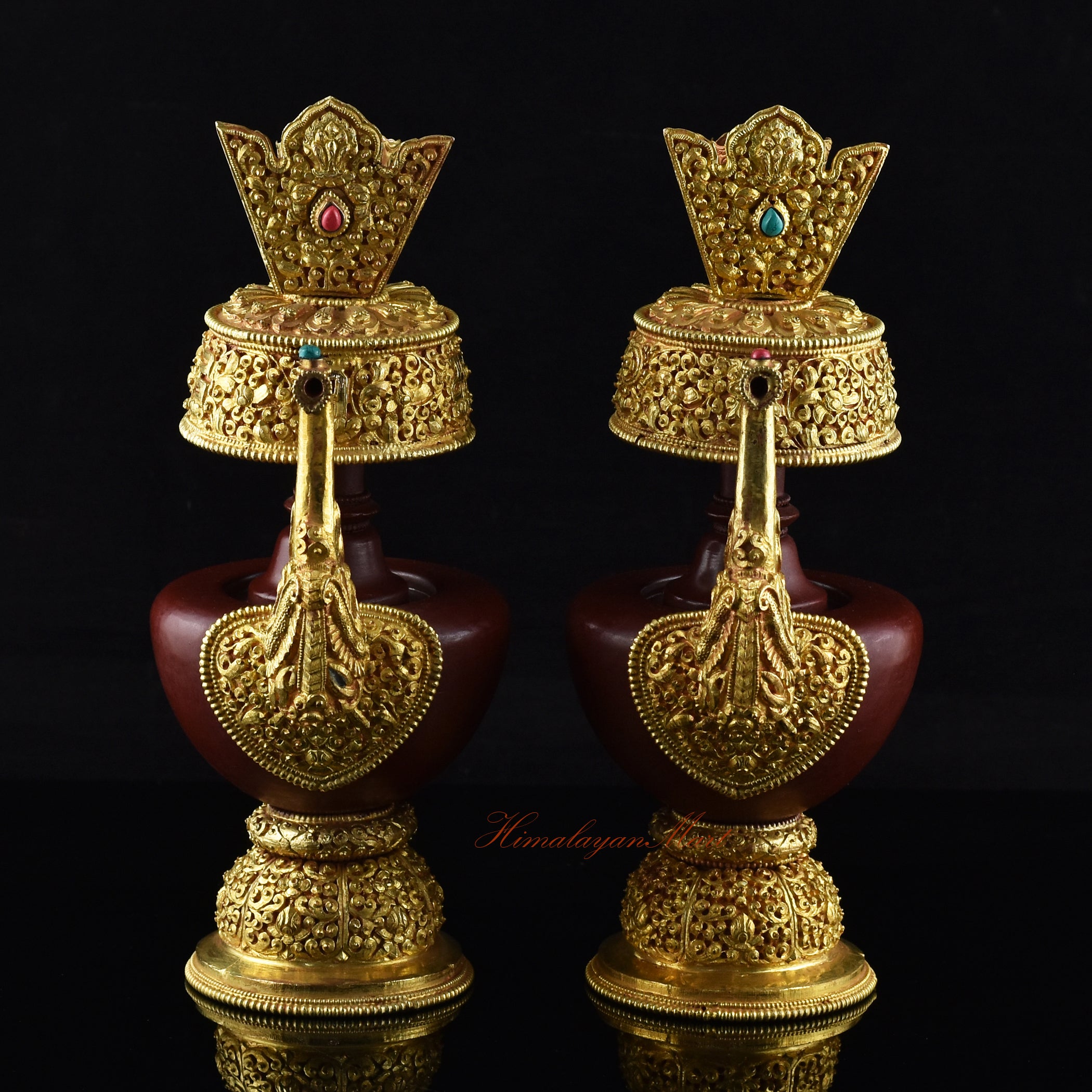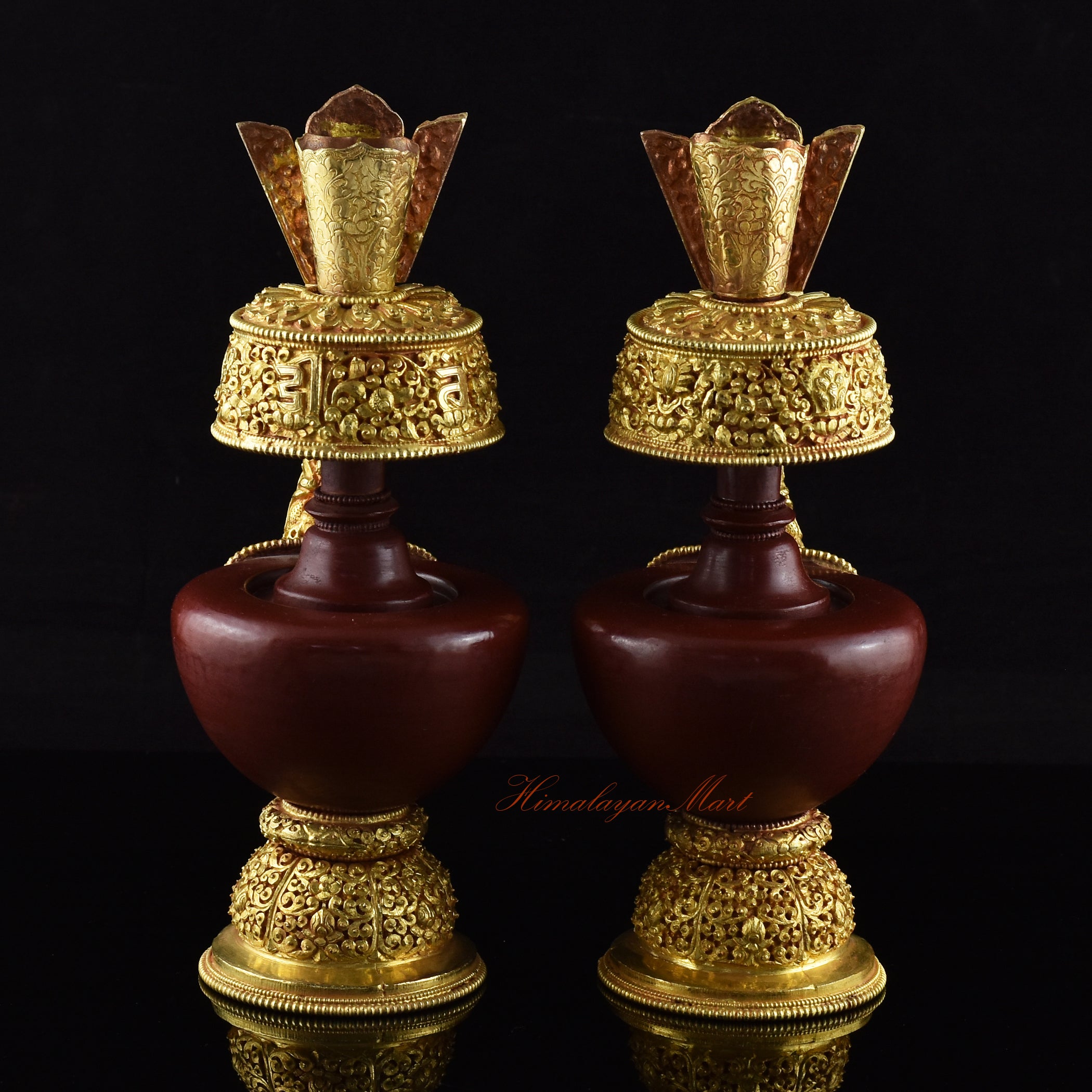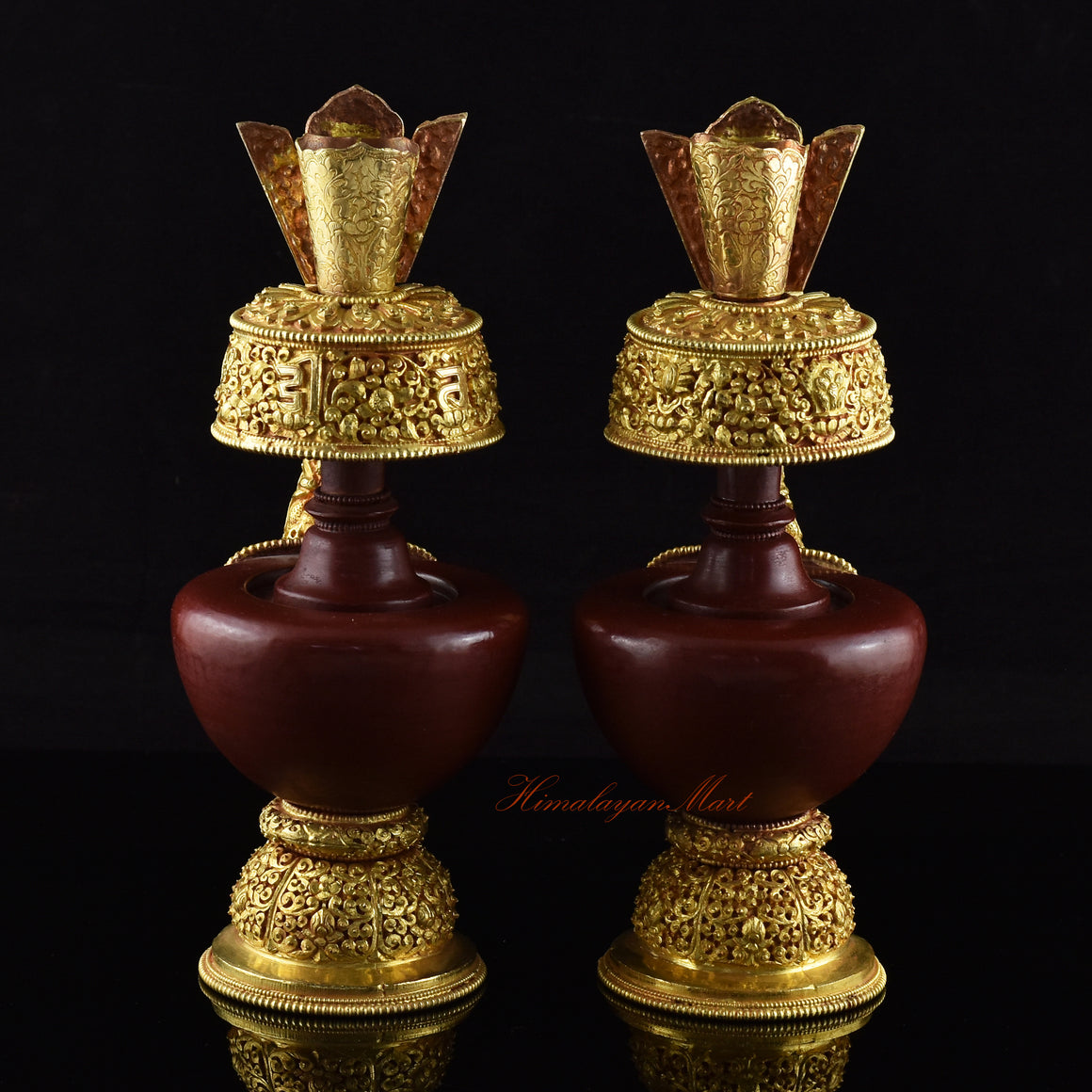 This Bhumpa Ritual Vase set is a sacred addition to any Buddhist altar or ritual practice. Expertly handcrafted from durable copper alloy, each vase is richly gilded with 24K gold. A red polished finish enhances its traditional Tibetan Buddhist aesthetic, radiating warmth and reverence.