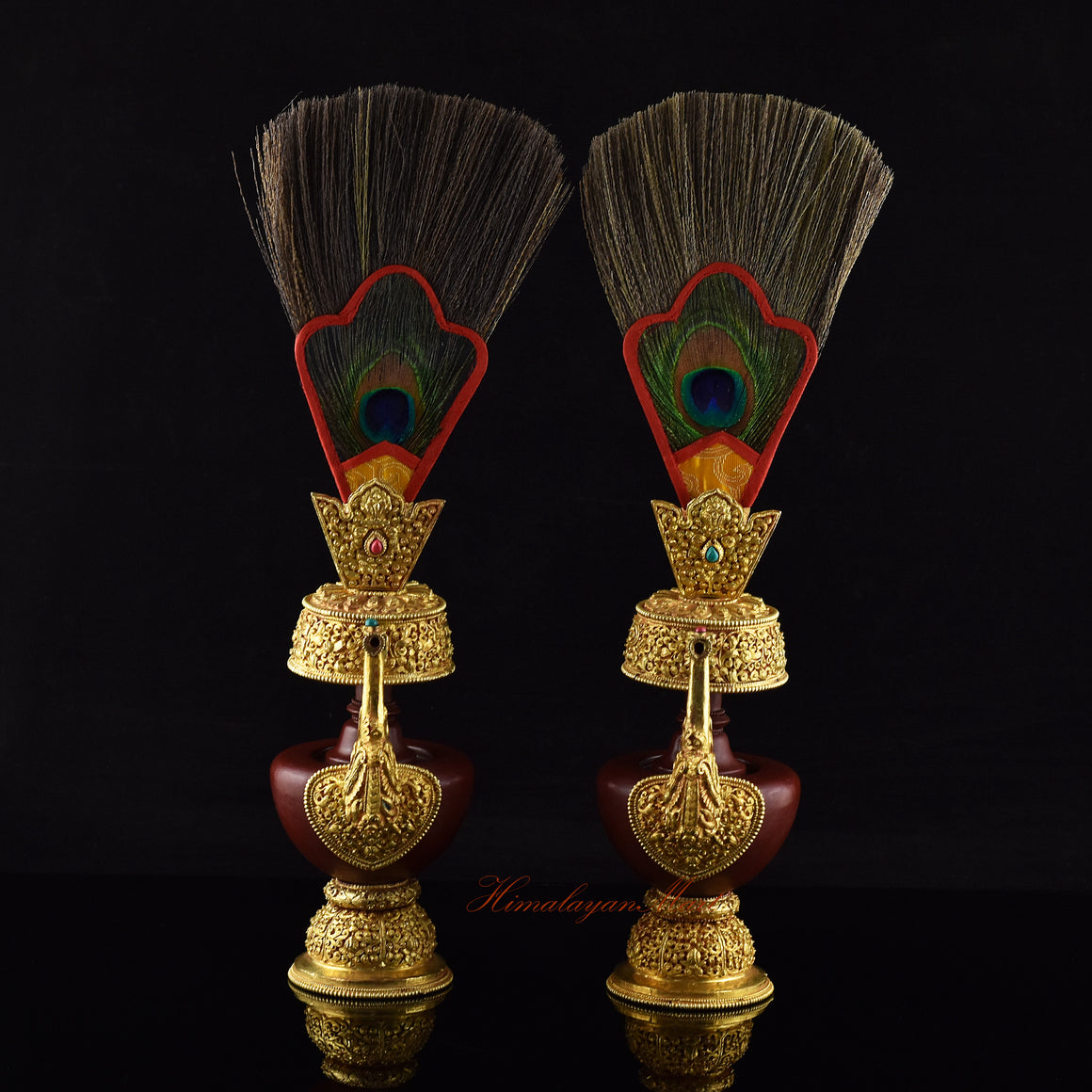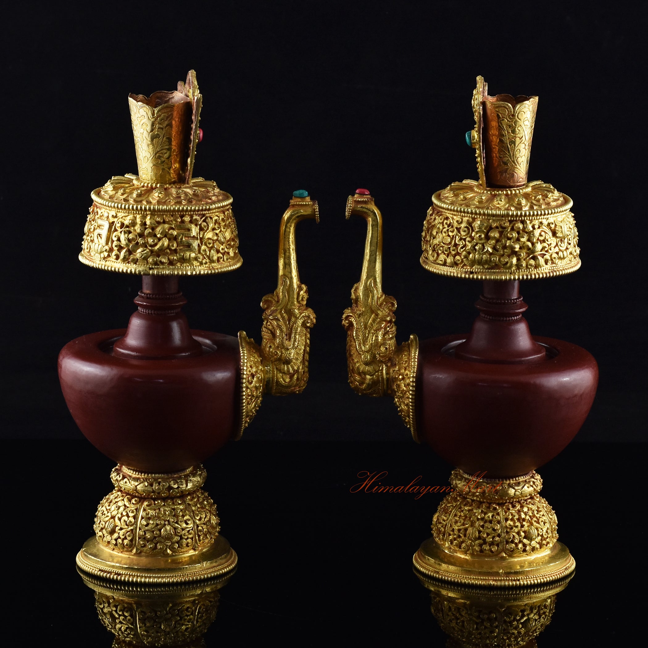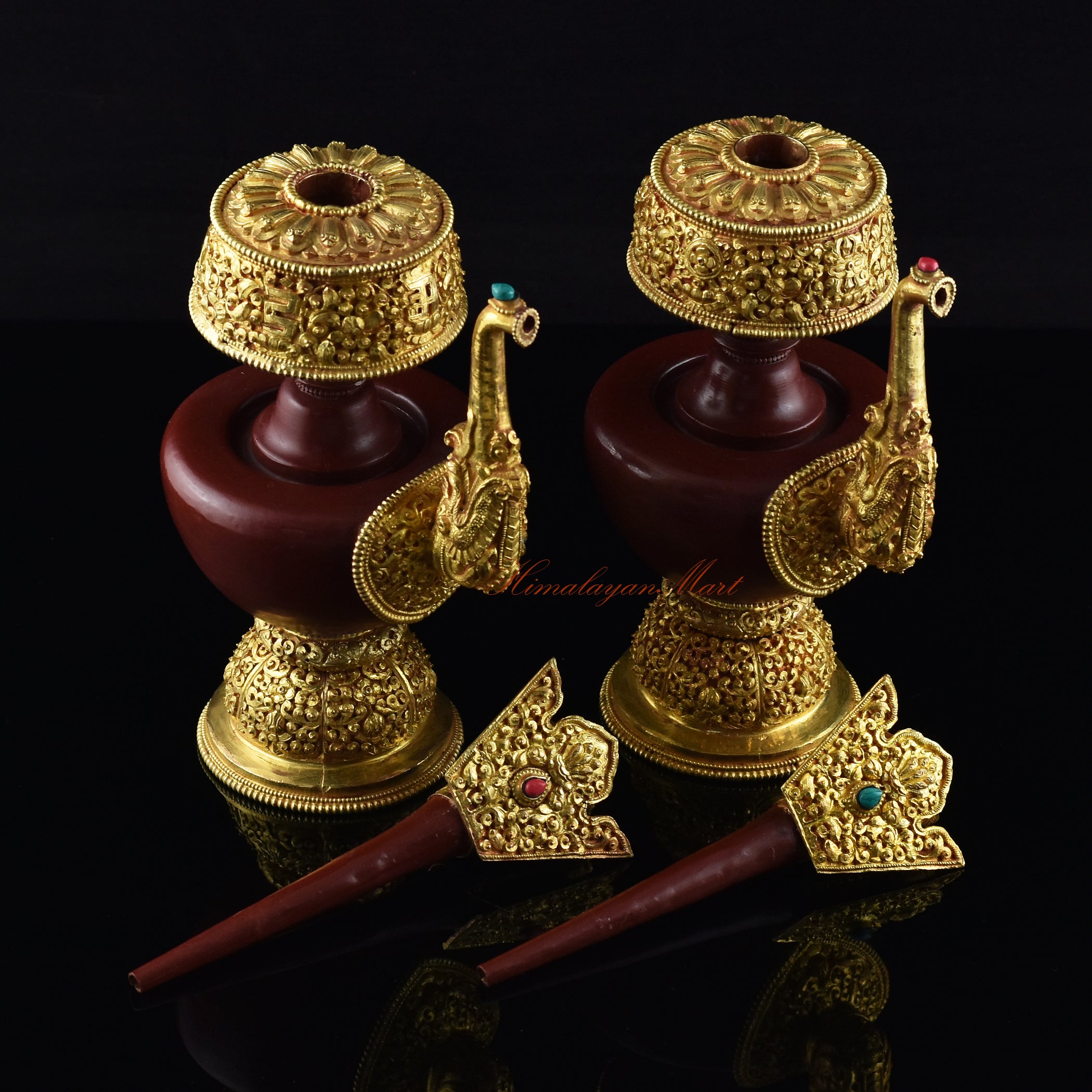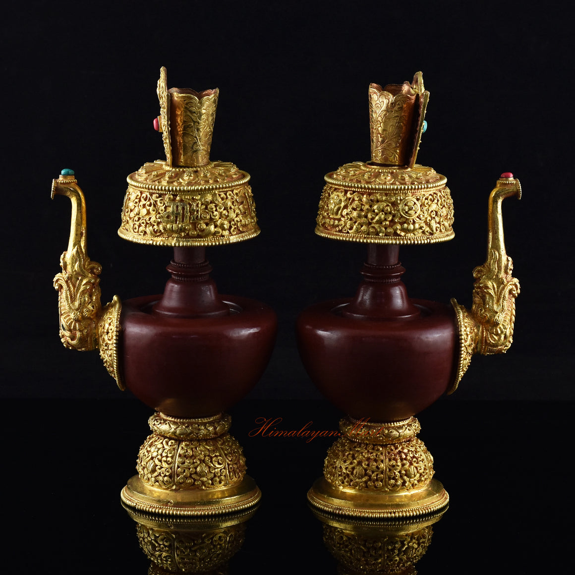 This Bhumpa Ritual Vase set is a sacred addition to any Buddhist altar or ritual practice. Expertly handcrafted from durable copper alloy, each vase is richly gilded with 24K gold. A red polished finish enhances its traditional Tibetan Buddhist aesthetic, radiating warmth and reverence.