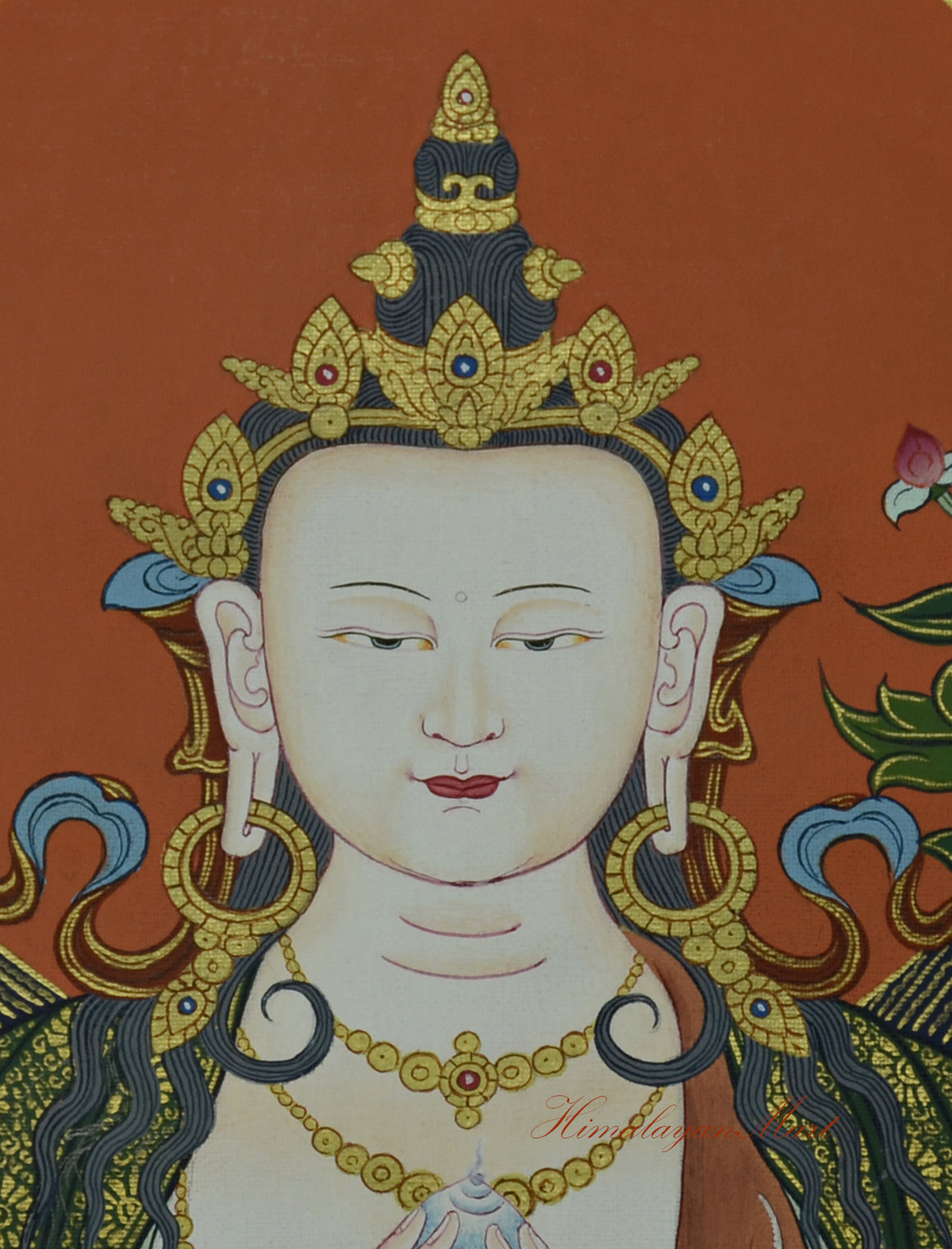 This scroll painting depicts Chenrezig, the Bodhisattva of Compassion, revered for infinite kindness and mercy. It serves as a powerful meditation aid, guiding the mind toward peace and compassion. The artwork is often used in personal practice, altars, or monastery spaces.
