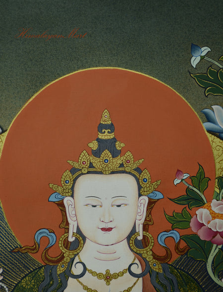 The Chenrezig Scroll Painting is a sacred Tibetan Buddhist artwork, rich in spiritual symbolism. It is beautifully hand-painted on high-quality cotton canvas using vibrant acrylic paints. Genuine 24K gold detailing enhances the intricate design in traditional Tibetan style. Finely hand-crafted by skilled artisans from Nepal, preserving ancient sacred art traditions.