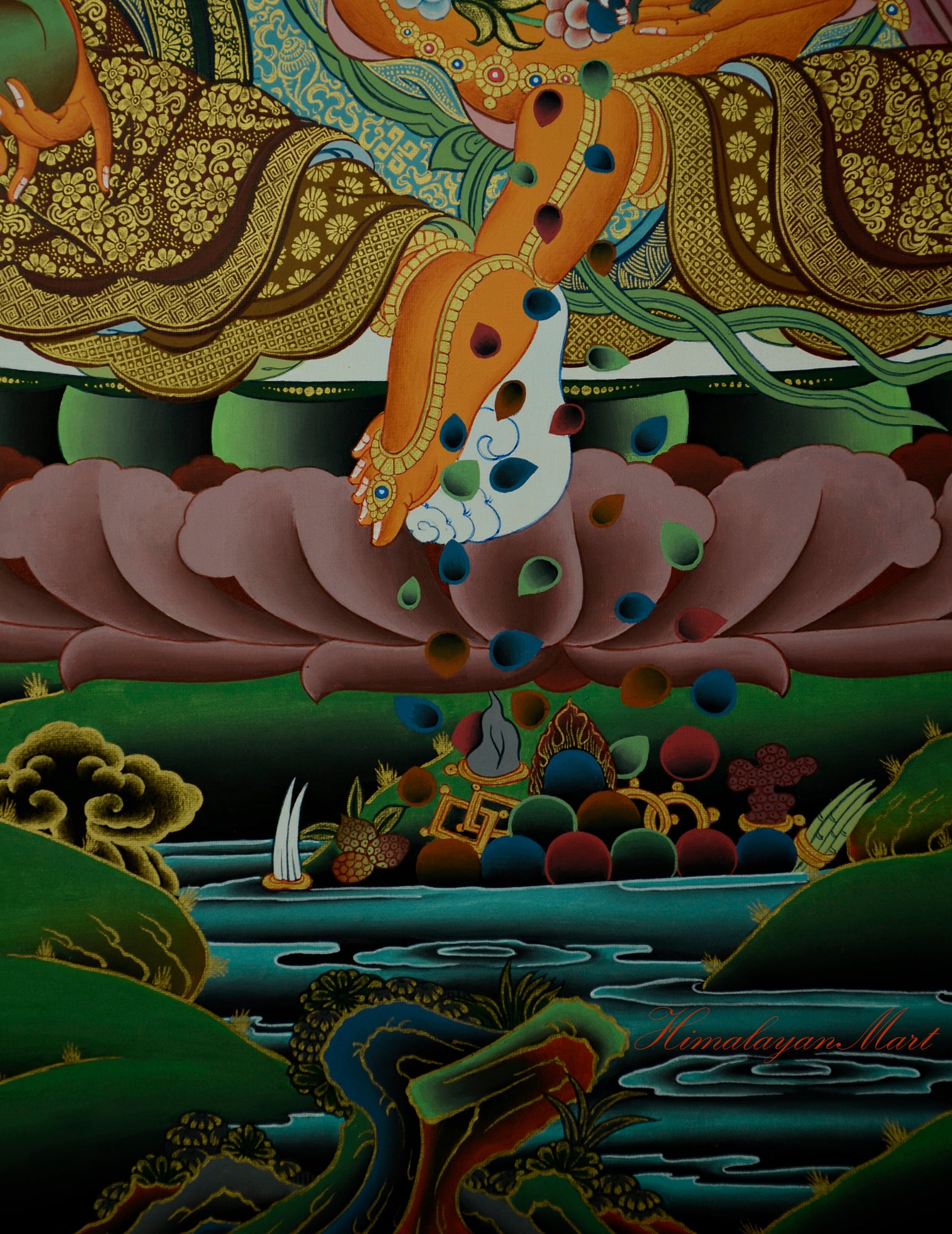 The thangka serves as a sacred tool in meditation and ritual practice. It invites blessings of abundance and protection into the practitioner’s life. Beyond spiritual use, it makes a meaningful addition to home altars or meditation spaces. Its vibrant colors and gold highlights also enhance any room’s décor with cultural richness.