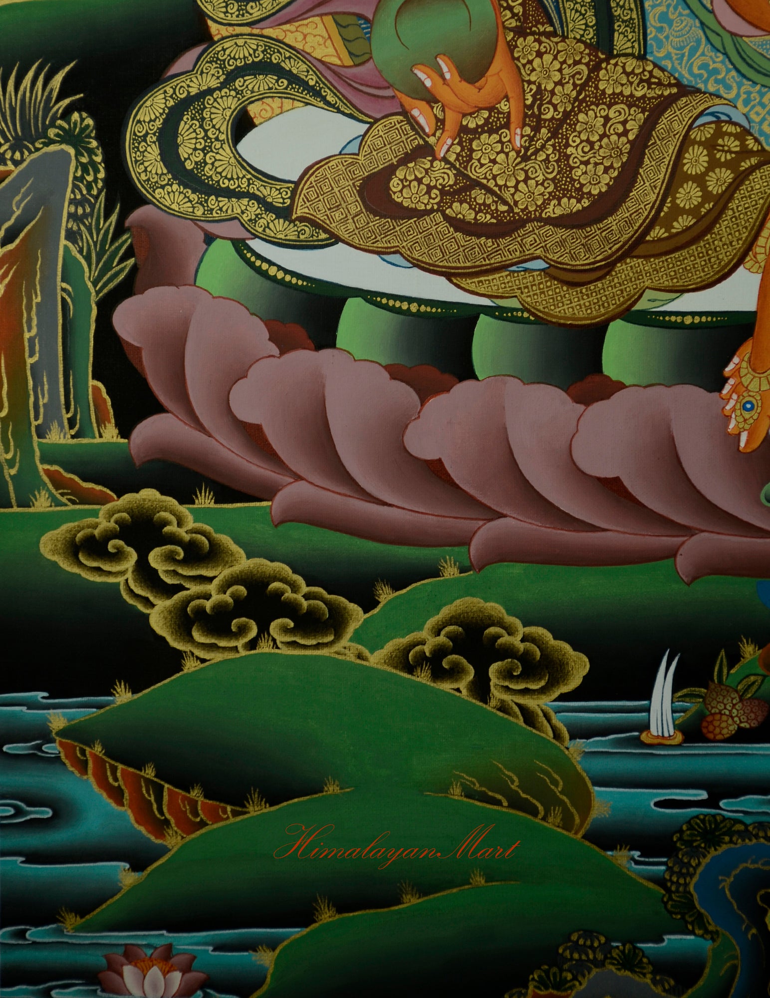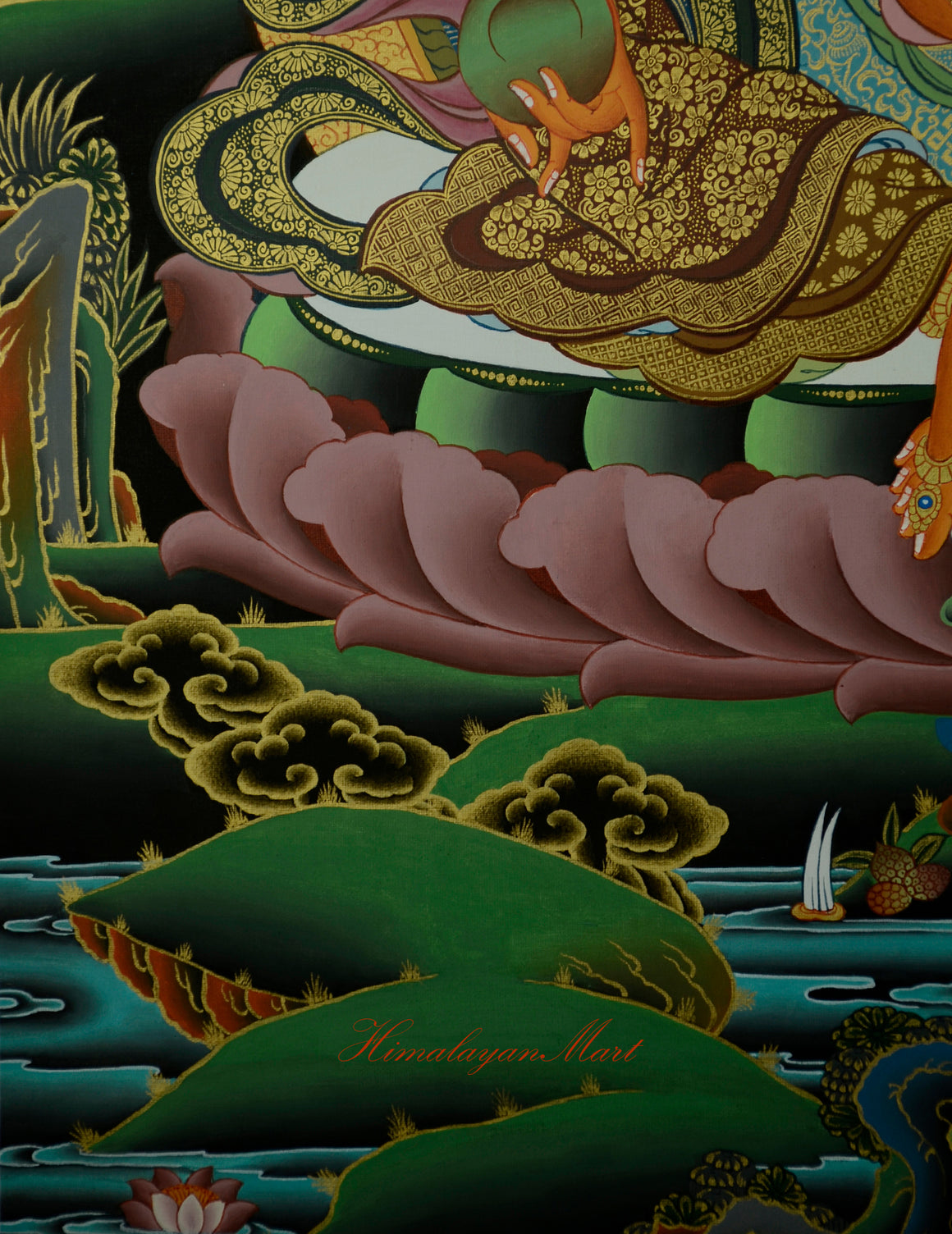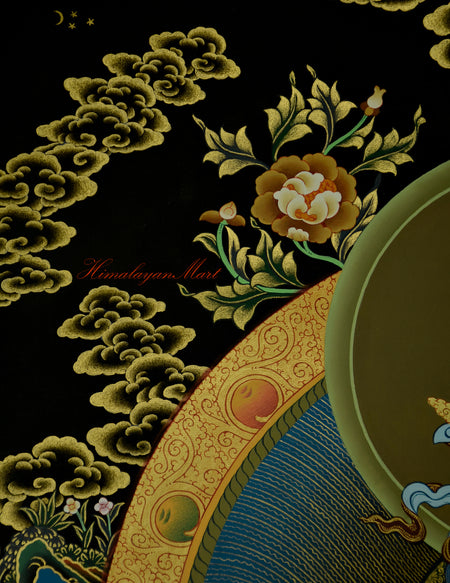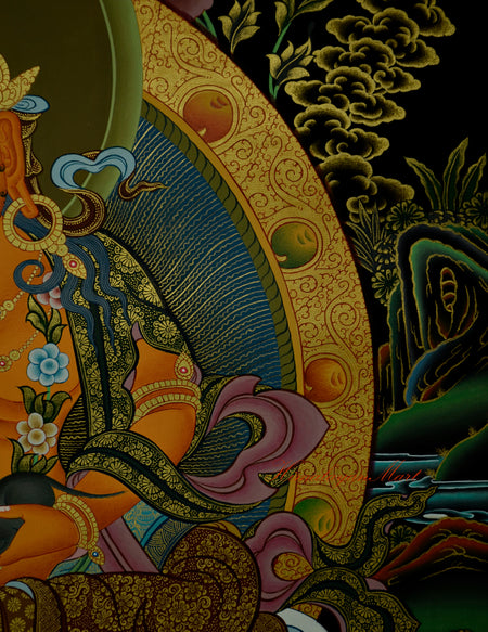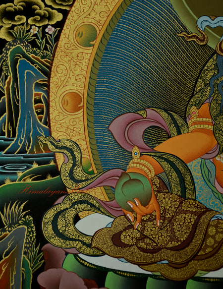 The Dzambhala Tibetan Thangka is a stunning example of traditional Buddhist art. It is hand-painted on cotton canvas using vibrant acrylic paints. The artwork is carefully embellished with 24 Karat gold accents, adding a sacred glow and refined elegance. Crafted in the traditional Karmakoti style, it reflects centuries of Tibetan artistic heritage.