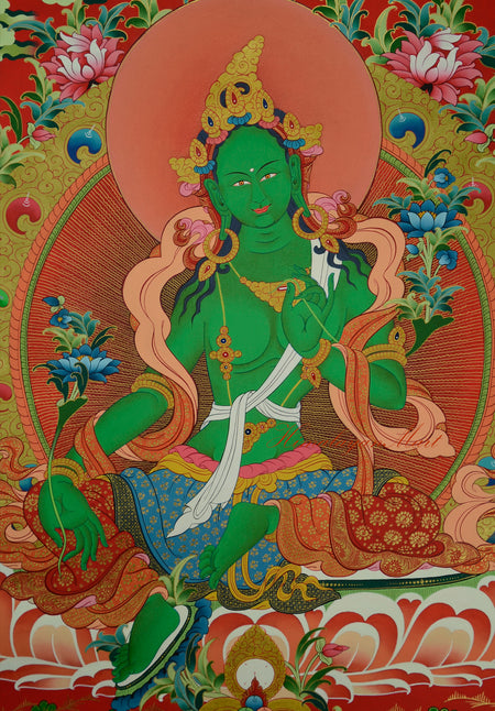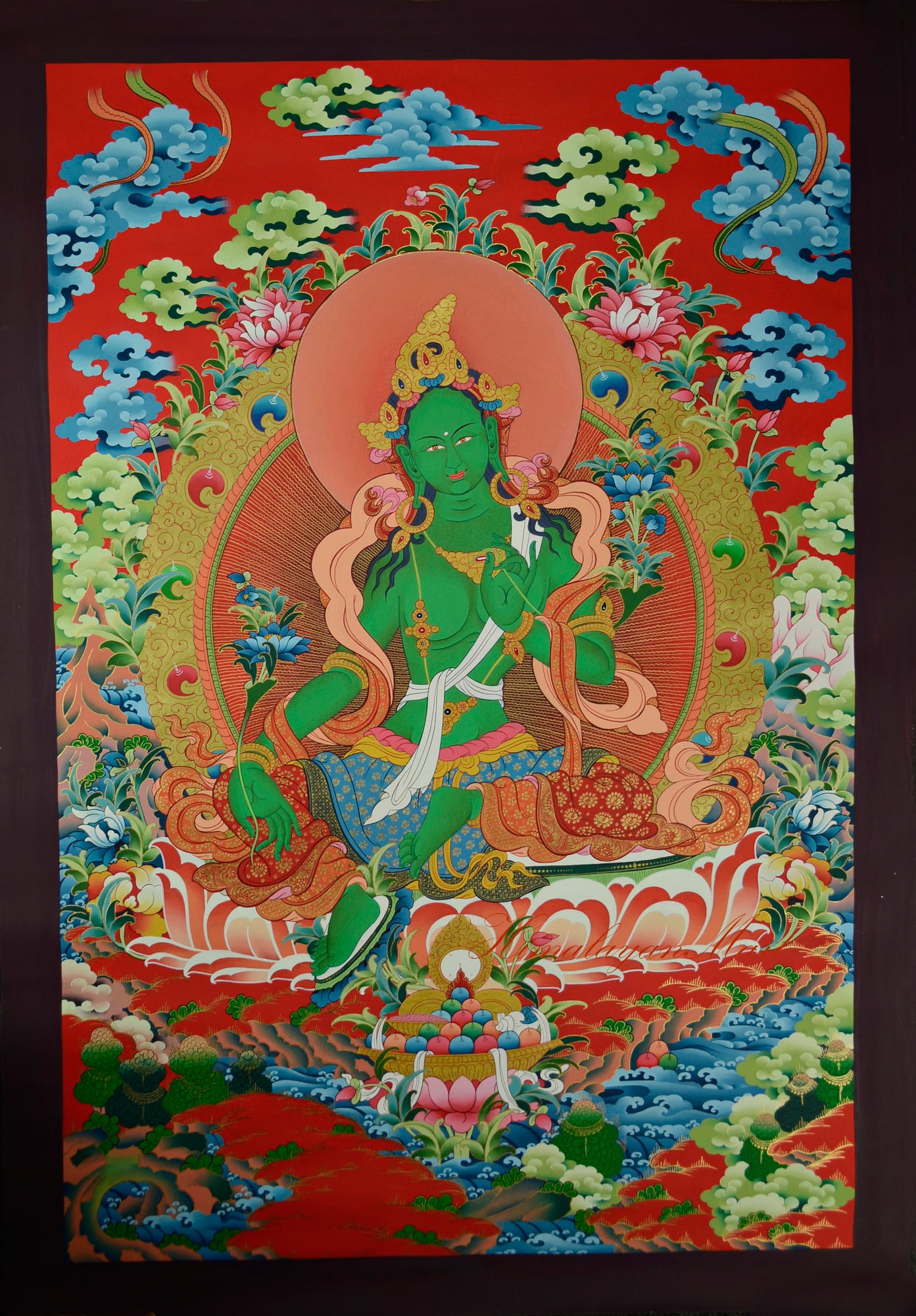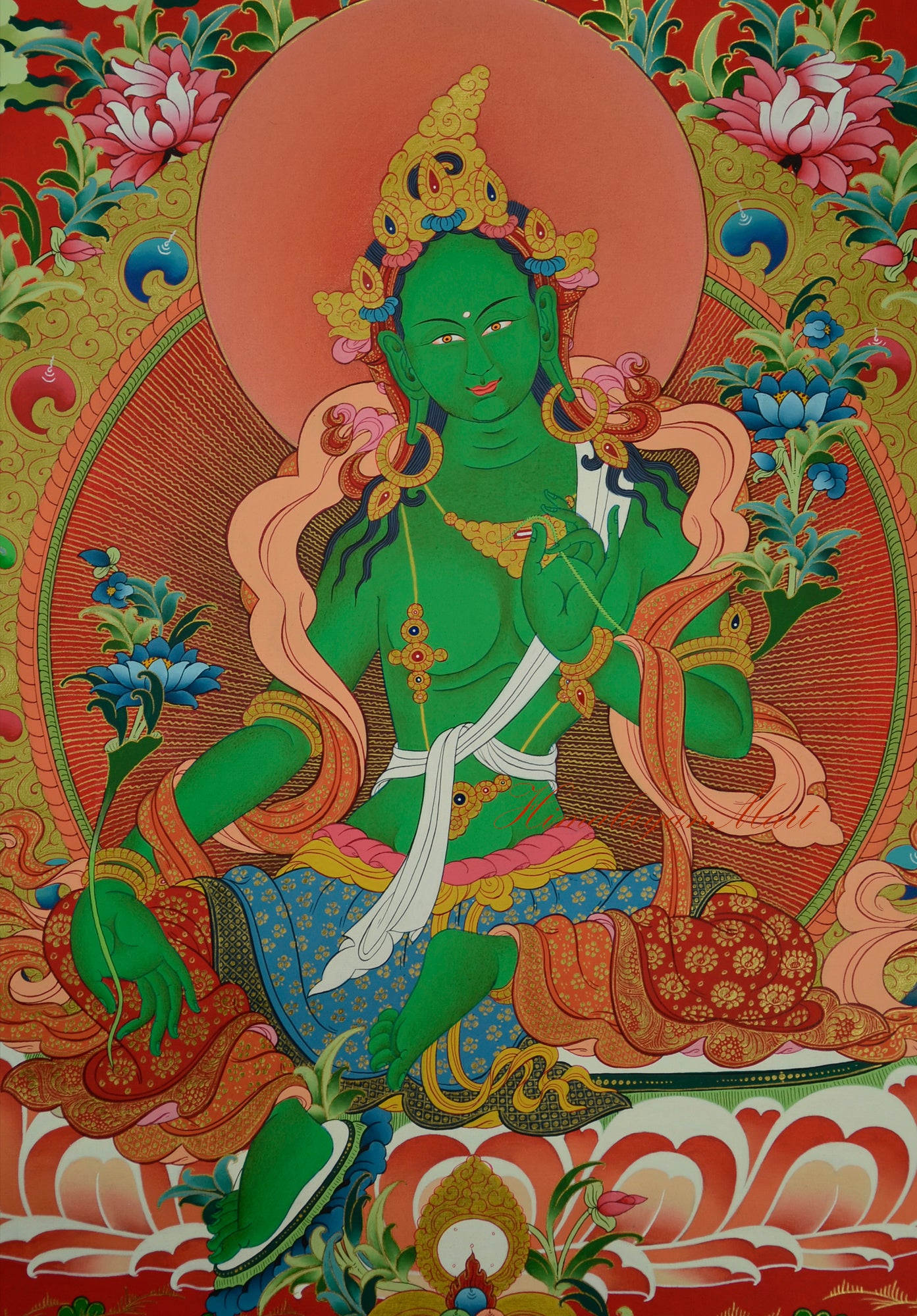 Hand-Painted Green Tara Thangka – Hand-Painted Tibetan Scroll Painting from Nepal