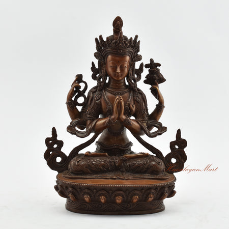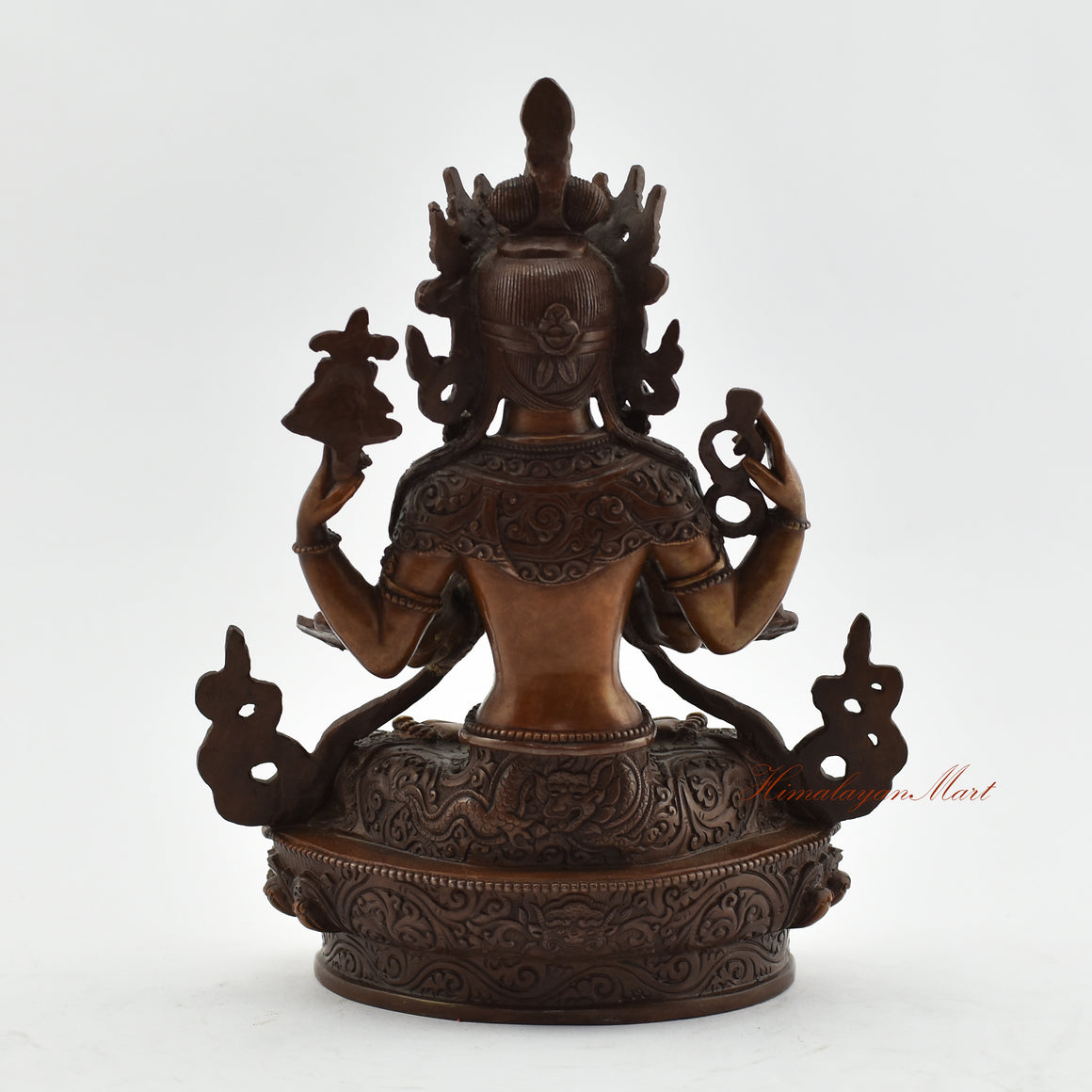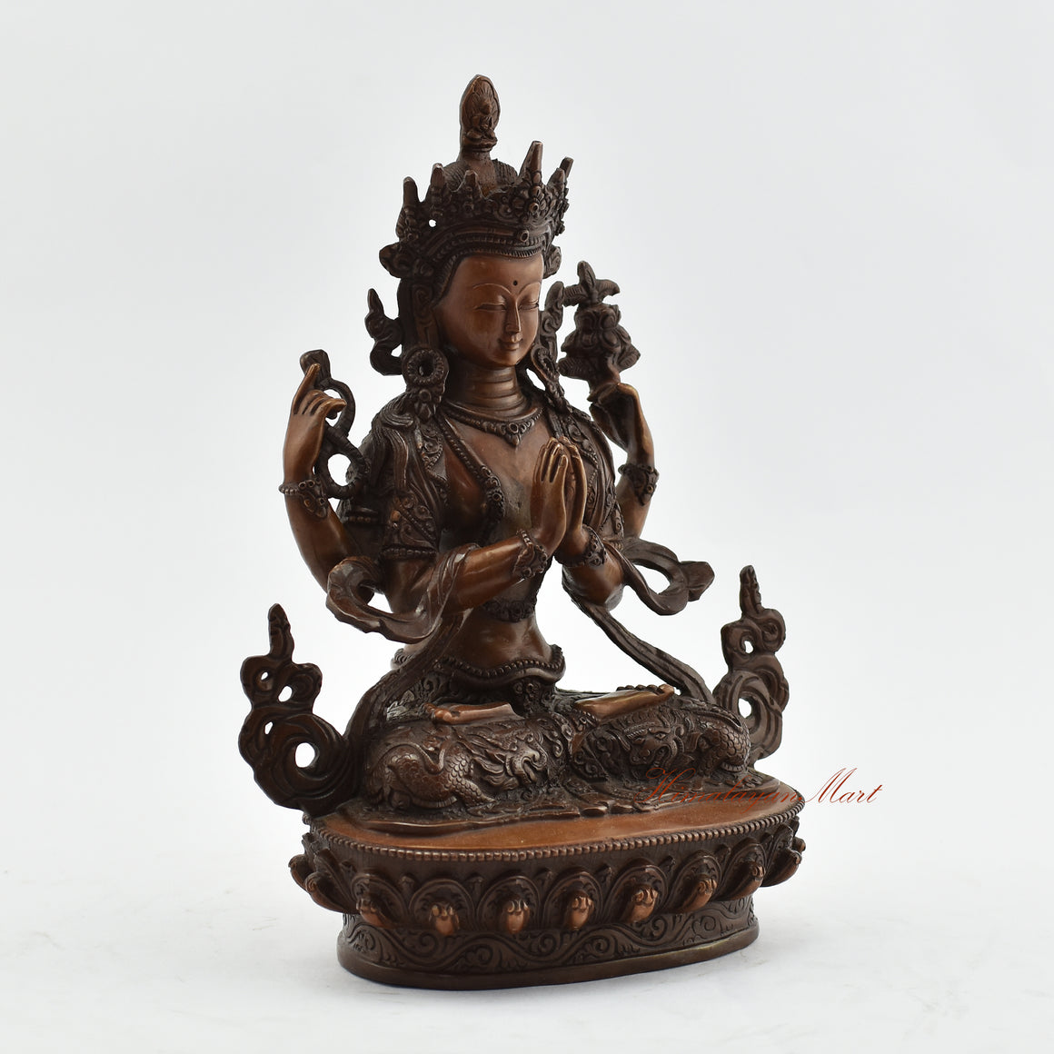 Handmade Chenrezig Statue: This stunning statue of Chenrezig, or Four-Armed Avalokiteshvara, is a testament to ancient sacred art. Crafted from copper alloy using the Lost Wax Method, it features intricate carvings of dragons and Chhepu, a mythical guardian. The statue's rich, antique appearance is enhanced by a red hue oxidation finish. Chenrezig's four arms hold sacred objects symbolizing love, wisdom, and protection. Crafted by skilled artisans in Patan, Nepal, this ancient art piece is a perfect addition to meditation spaces, altars, or fine collections, radiating peace and divine blessings.