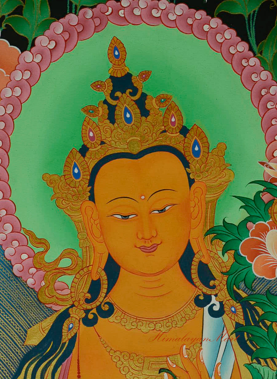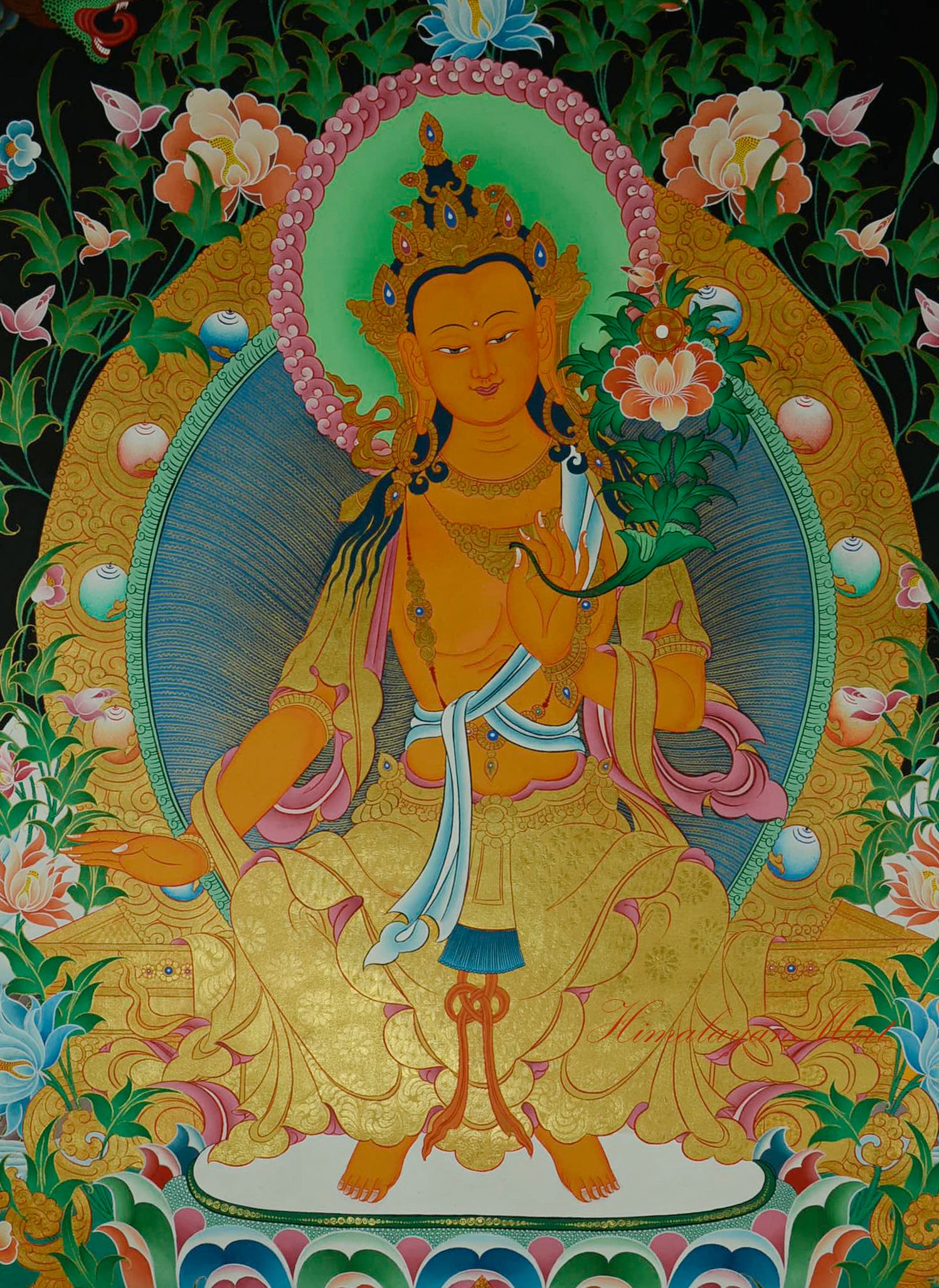 This exquisite Maitreya Buddha Thangka is a masterfully hand-painted depiction of the Future Buddha, revered in Tibetan Buddhism for his promise to appear in the world when the teachings of Dharma are forgotten. He is shown seated in his iconic posture atop a beautifully adorned throne, which rests on a blooming lotus base symbolizing purity and spiritual awakening.
