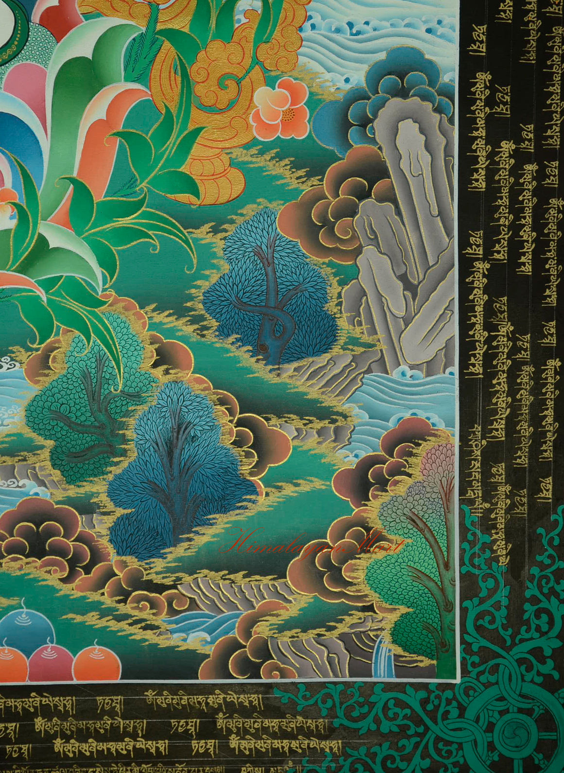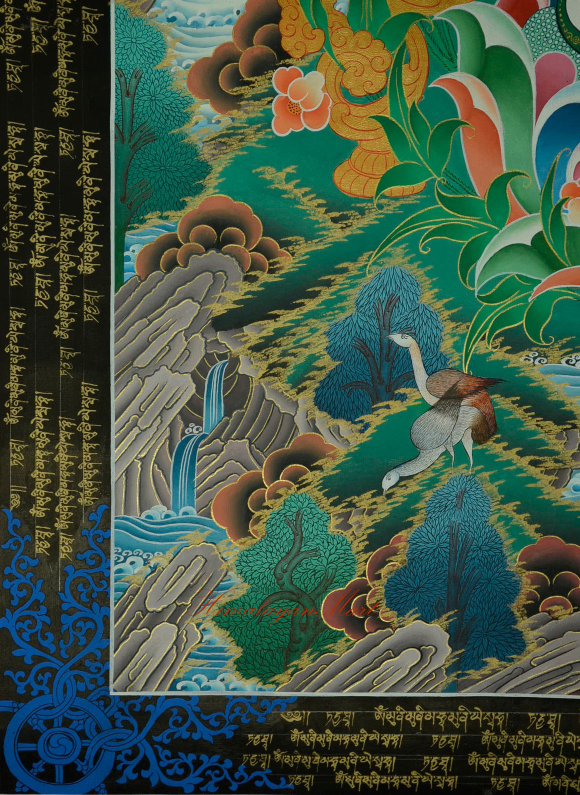 On both sides of the throne, snow-capped mountains and lush hills rise from behind drifting clouds. Delicate waterfalls cascade down into sacred ponds, reflecting the serene and harmonious realm of the Bodhisattva.