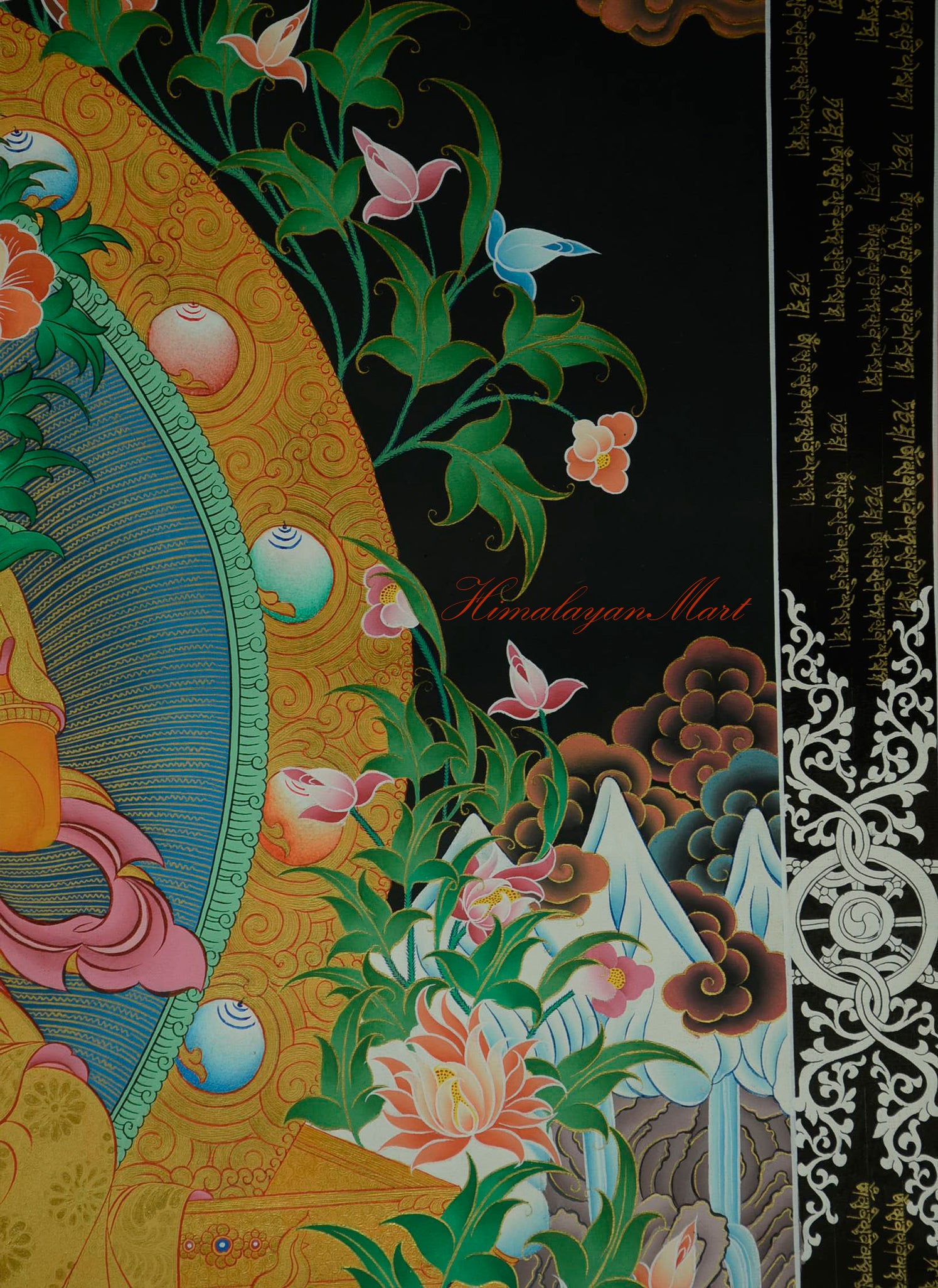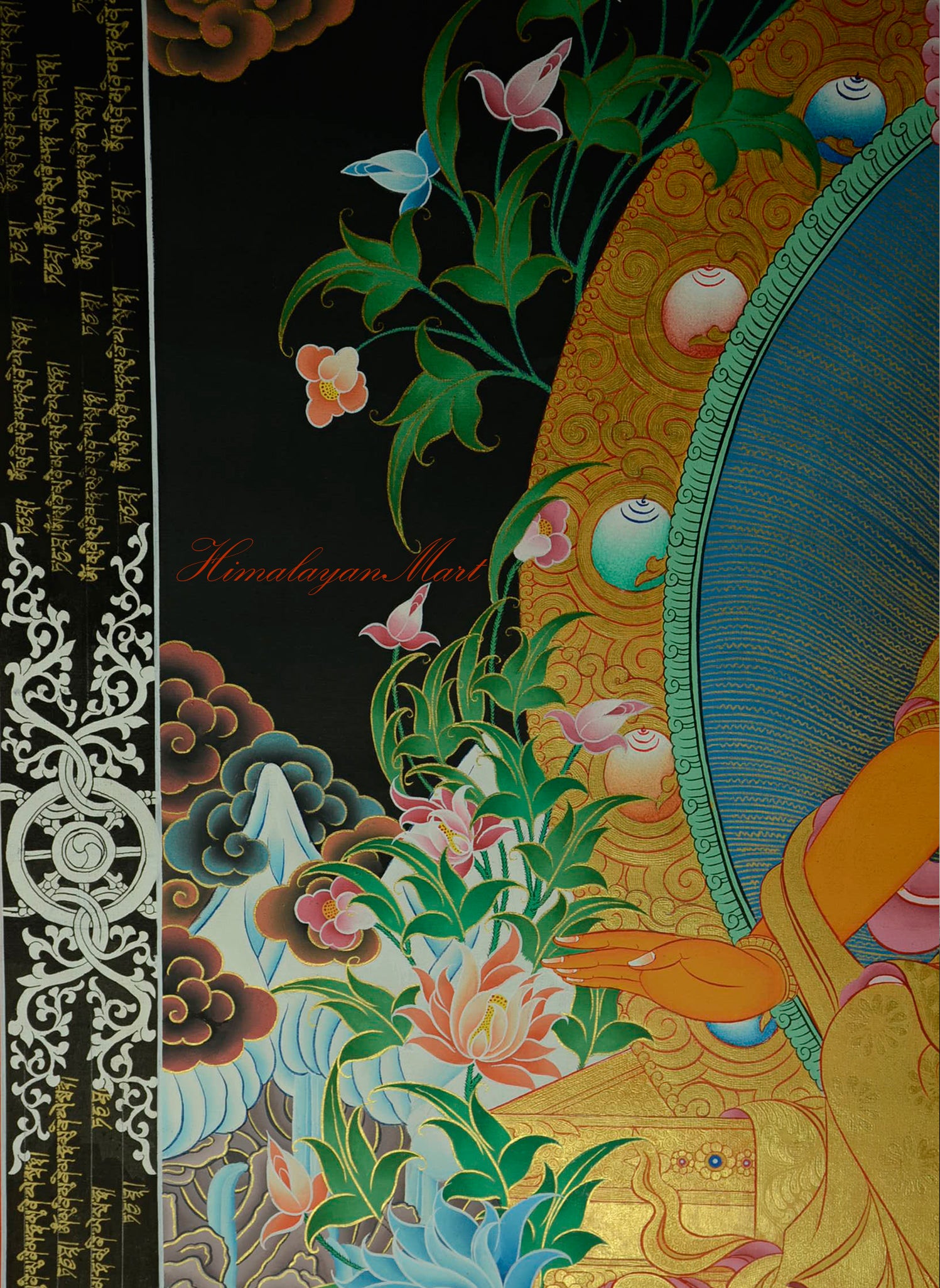 The painting is bordered with Dharma wheels in various colors, signifying the infinite turning of the wheel of Dharma. This Maitreya Buddha Thangka is hand-painted on high-quality cotton canvas using durable acrylic paints, enhanced with lavish 24K gold detailing, and set against a striking black background.