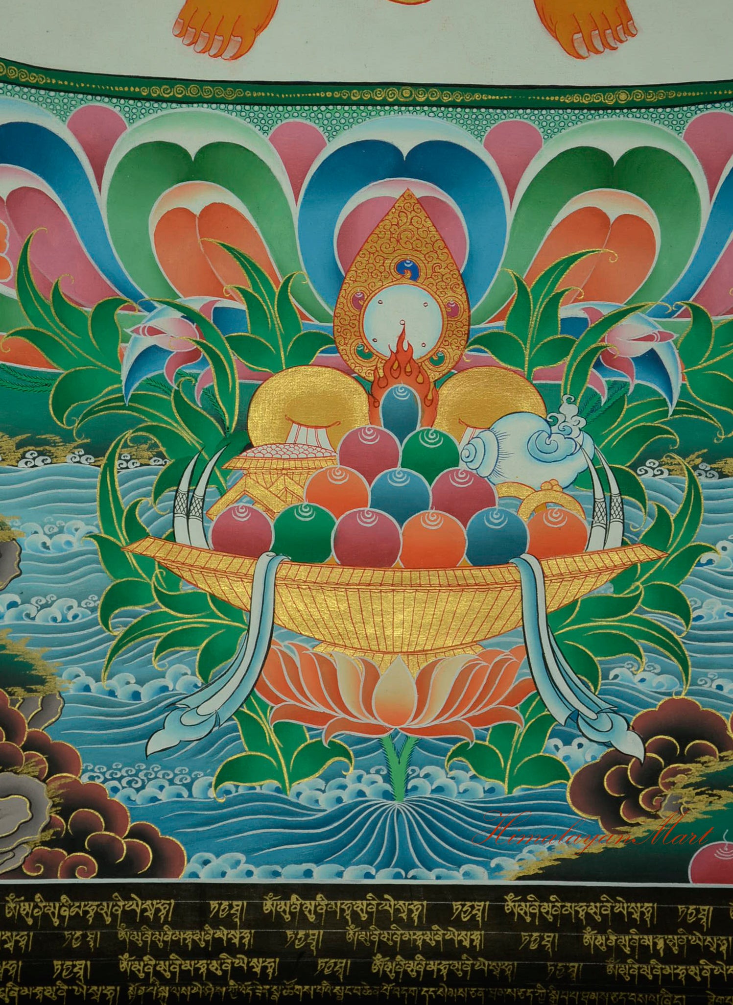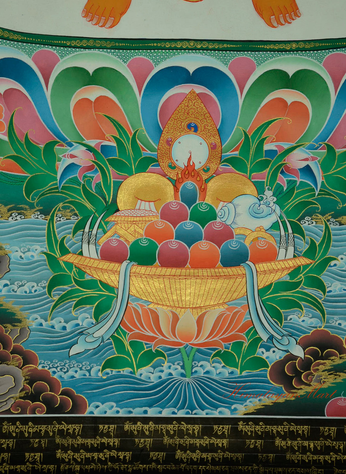 Below Maitreya Buddha, the landscape continues with intricate depictions of trees, birds, waterfalls, and green hills, creating a vibrant scene of spiritual abundance. At the center bottom, an offering bowl rests on a lotus flower emerging from the sacred pond. It holds symbolic items representing the five senses: a mirror (sight), conch shell (sound), incense and perfume (smell), fruits or food (taste), and silk cloth (touch).