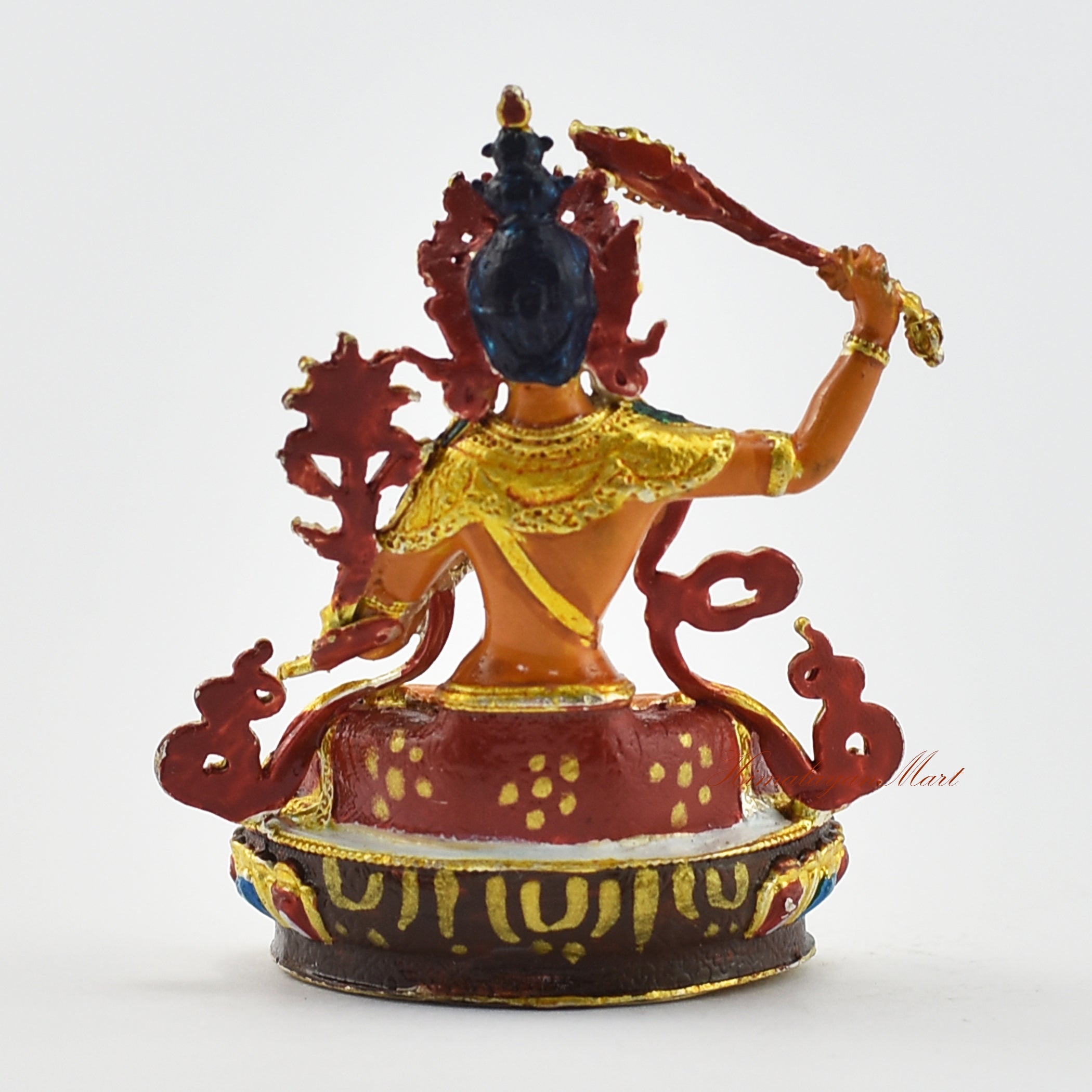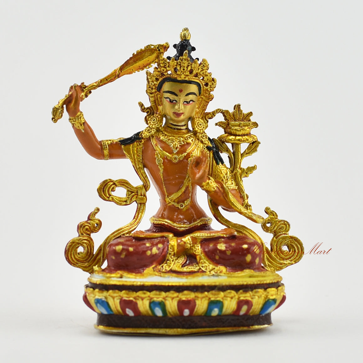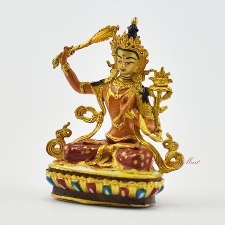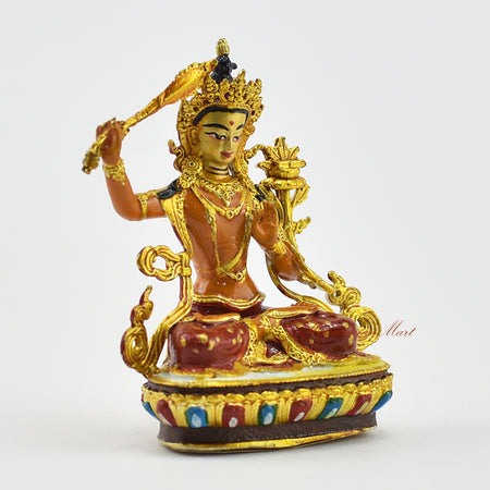This Manjushri Hand-Painted Statue: This fine Manjushri statue embodies artistry and profound symbolism. Crafted from high-quality copper alloy, it's lavishly adorned with lustrous gold plating. Meticulous hand-painting, especially on the face, yields a rich and sensuous finish. Manjushri, the Bodhisattva of Wisdom, represents intellect, learning, and enlightened awareness.