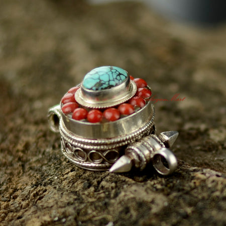 The finely carved silver reflects patience, discipline, and devotion shaped through generations. Precisely set gemstones enhance both beauty and spiritual intention. Turquoise represents protection, healing, and clarity of mind. Coral symbolizes vitality, life force, and auspicious blessings within Buddhist culture.