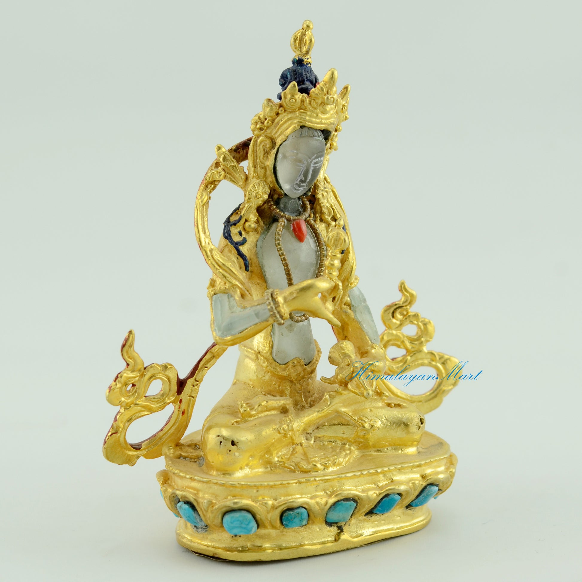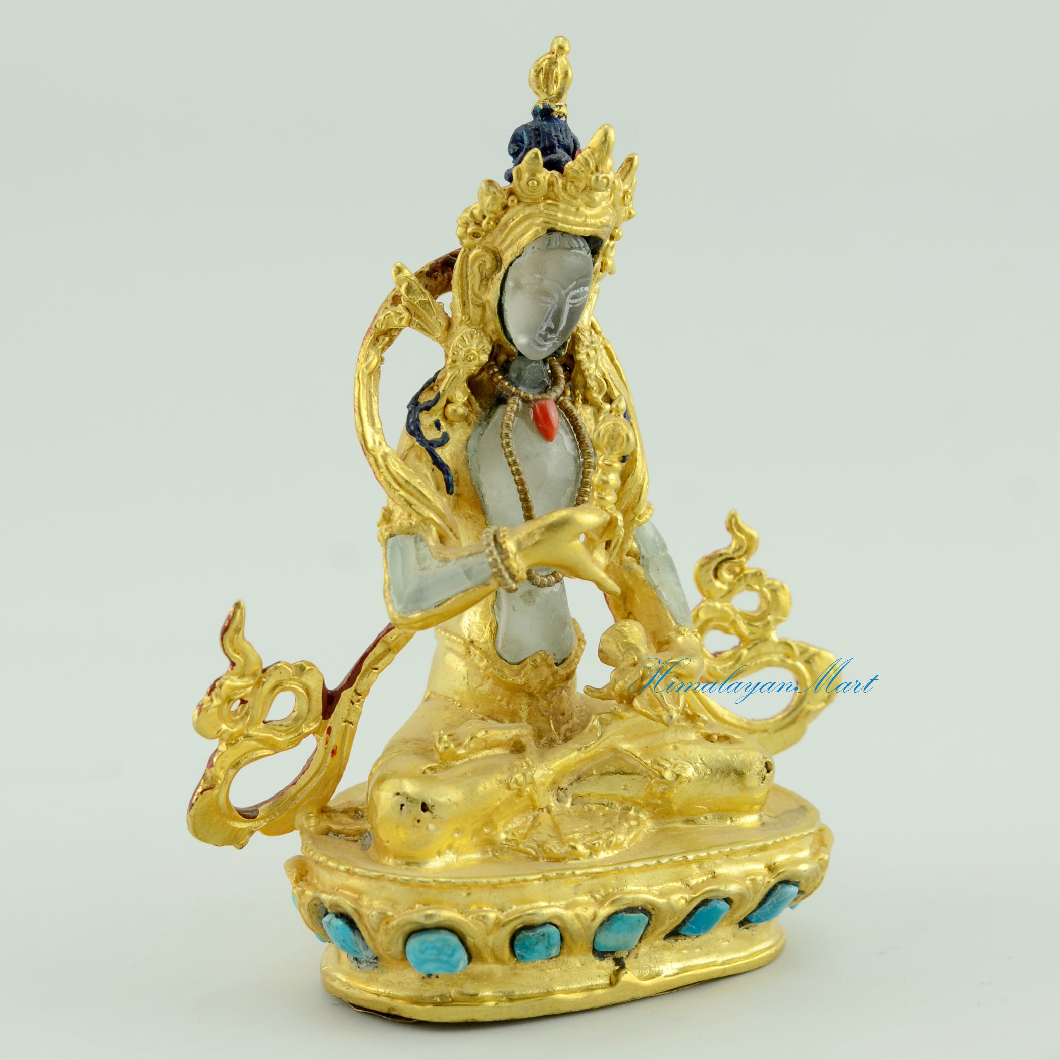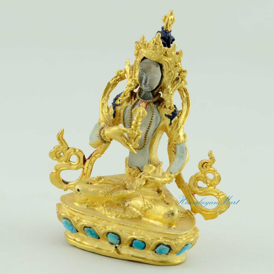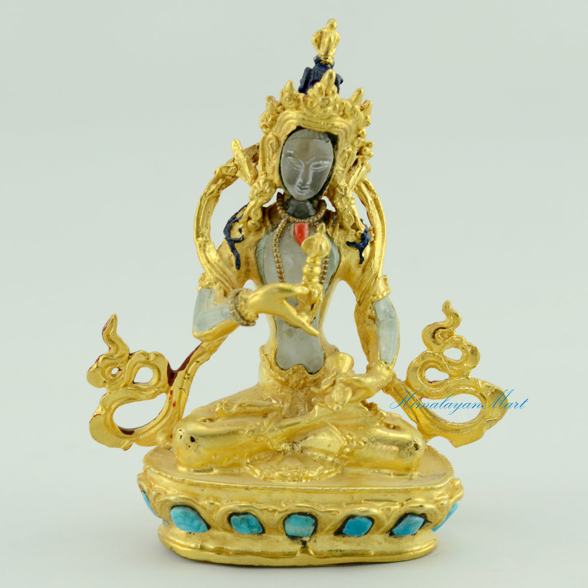 The Small Bajrasattva Statue, a revered Buddhist statue, is crafted from copper alloy and crystal using the lost wax method for spiritual transformation and purification.