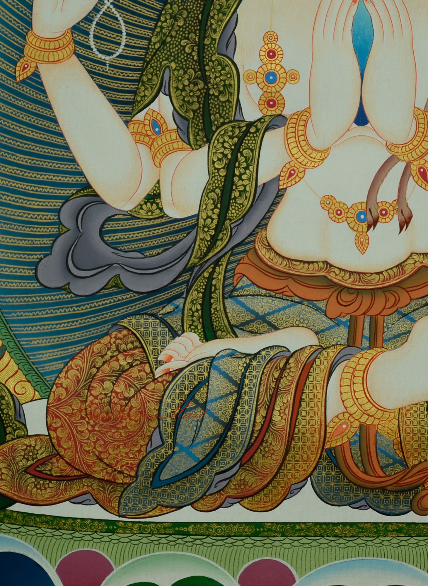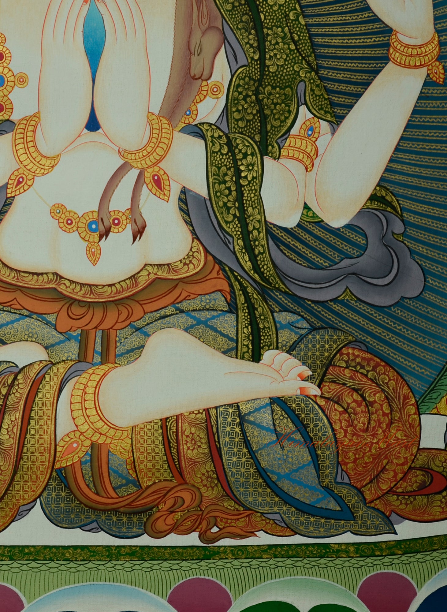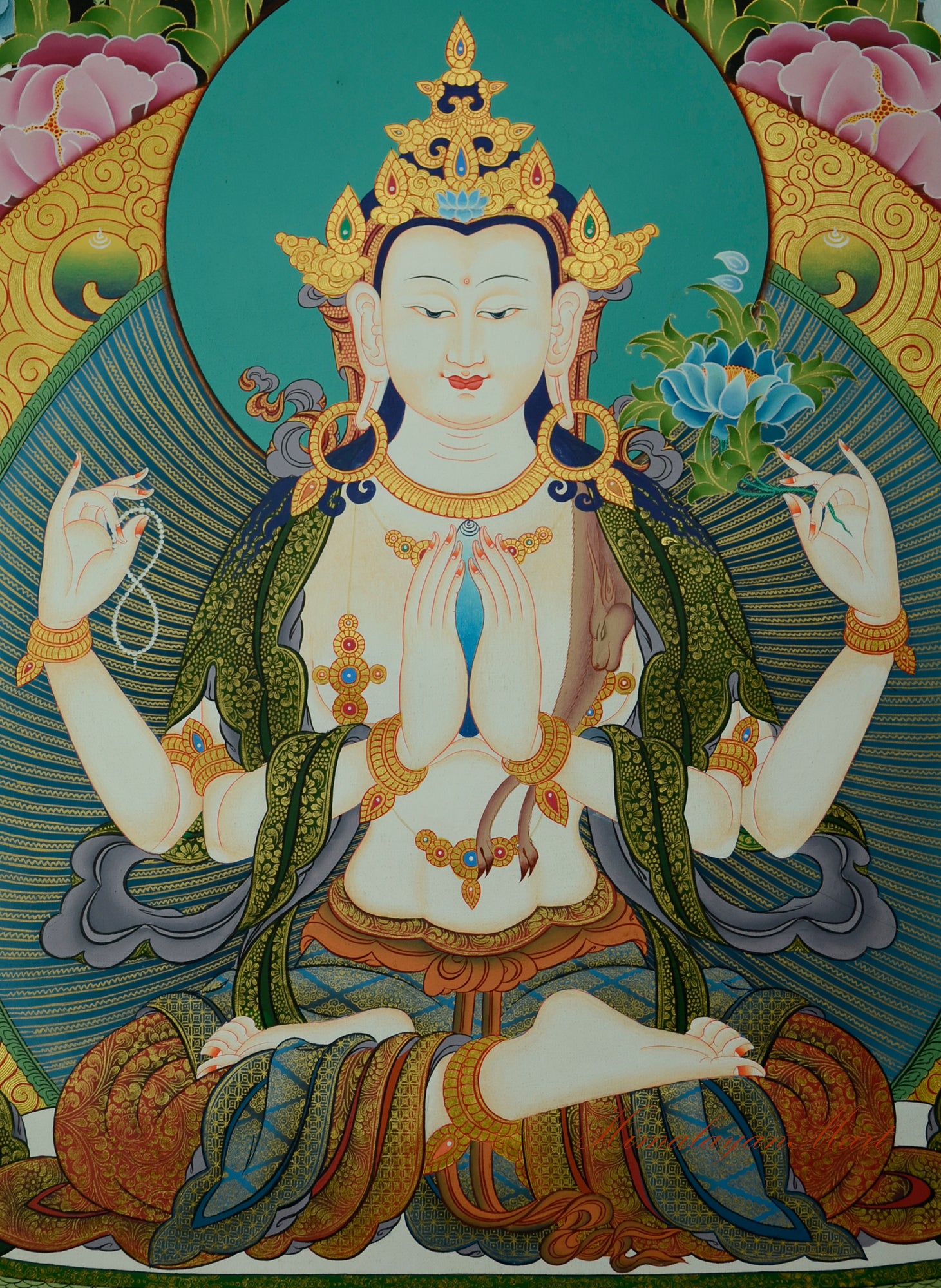 Tibetan Four-Armed Chenrezig Thangka - Hand-Painted Avalokiteshvara for Compassion