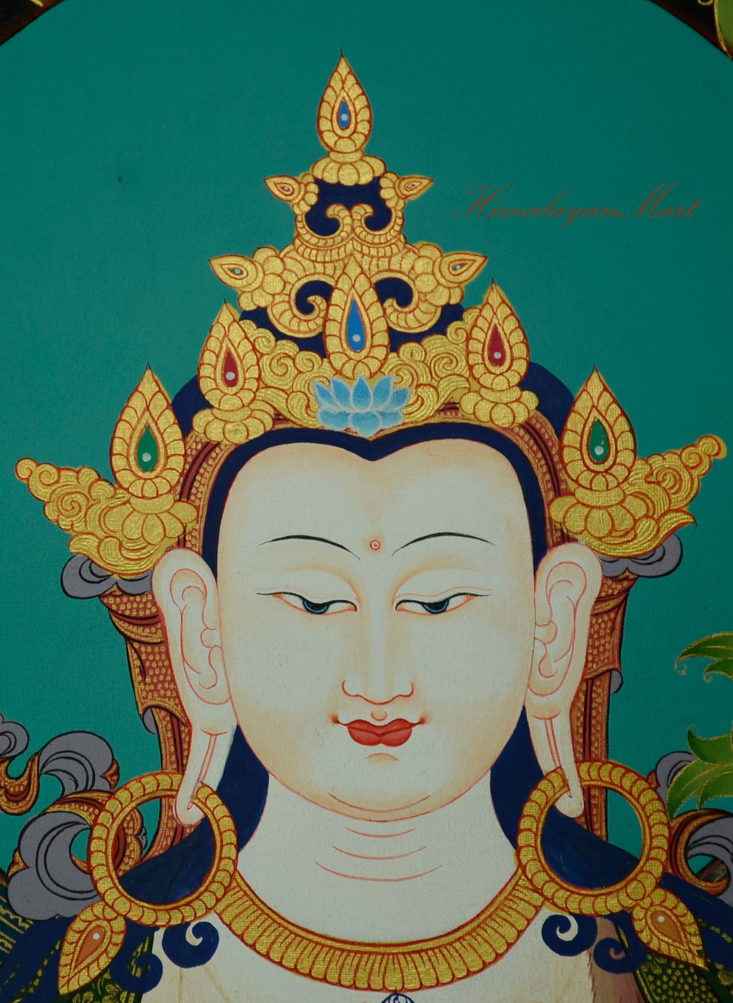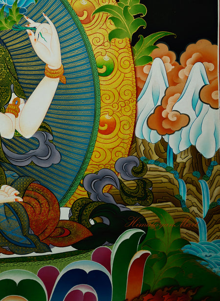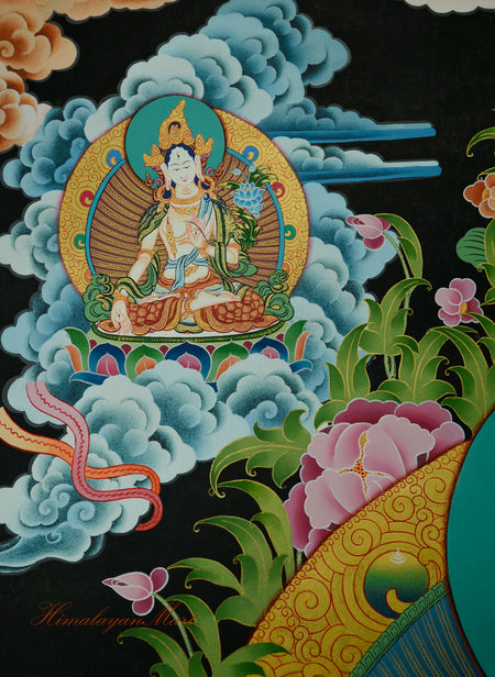 The upper portion of this exquisite Thangka showcases White Tara on the top right and Green Tara on the top left, both seated gracefully upon radiant lotus thrones amid delicate, floating clouds. At the center between them hovers Amitabha Buddha, serene and majestic, emanating a gentle radiance from his lotus seat directly above Chenrezig. This celestial arrangement forms a harmonious triad, embodying the energies of compassion, protection, and spiritual illumination, guiding the viewer toward inner peace and awakening.