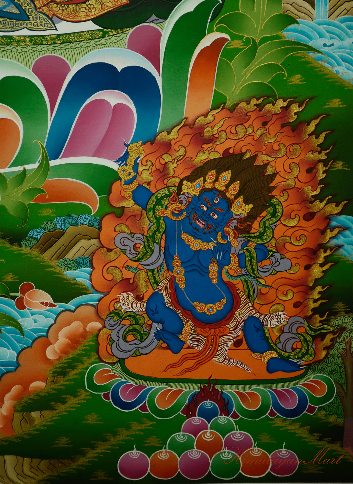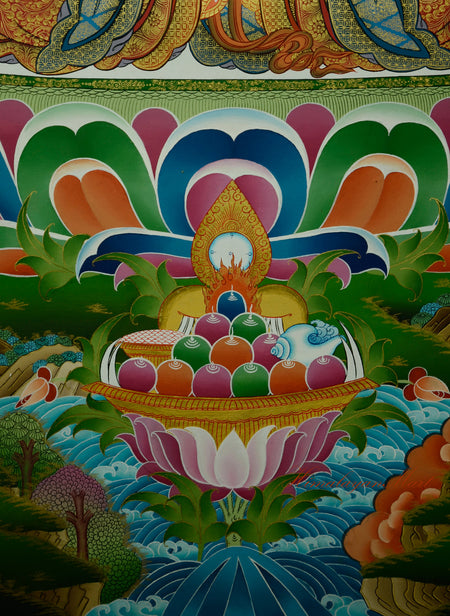 Between these two powerful deities lies a sacred pond, from which a lotus blooms, cradling a bowl of offerings dedicated to Chenrezig. These offerings symbolize the five senses: a mirror for sight, a conch shell and tusks for sound, incense and perfume for smell, fruits for taste, and silk cloth for touch. Each element is rendered with precision and intention, enhancing the sacred symbolism of the piece.