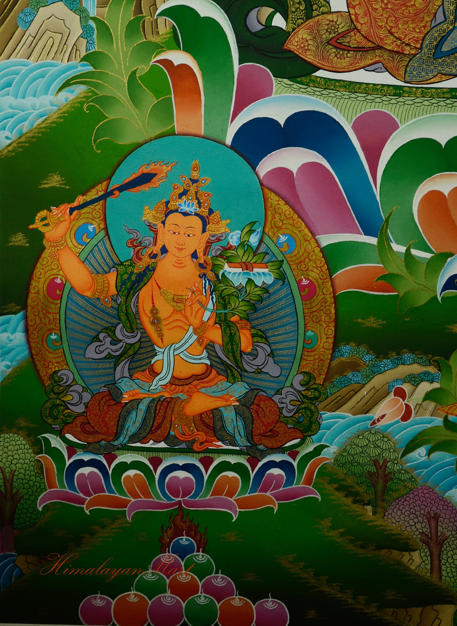 The surrounding landscape features majestic snow-capped mountains and cloud-veiled hills from which rivers cascade downward. These sacred waters flow into a pond below the central throne, symbolizing purification and the blessings that flow into the world. At the base of the painting, Manjushri appears on the bottom right, holding the sword of wisdom and the book of transcendent knowledge. On the bottom left is Vajrapani, embodying power and protection, seated firmly in his classic posture.