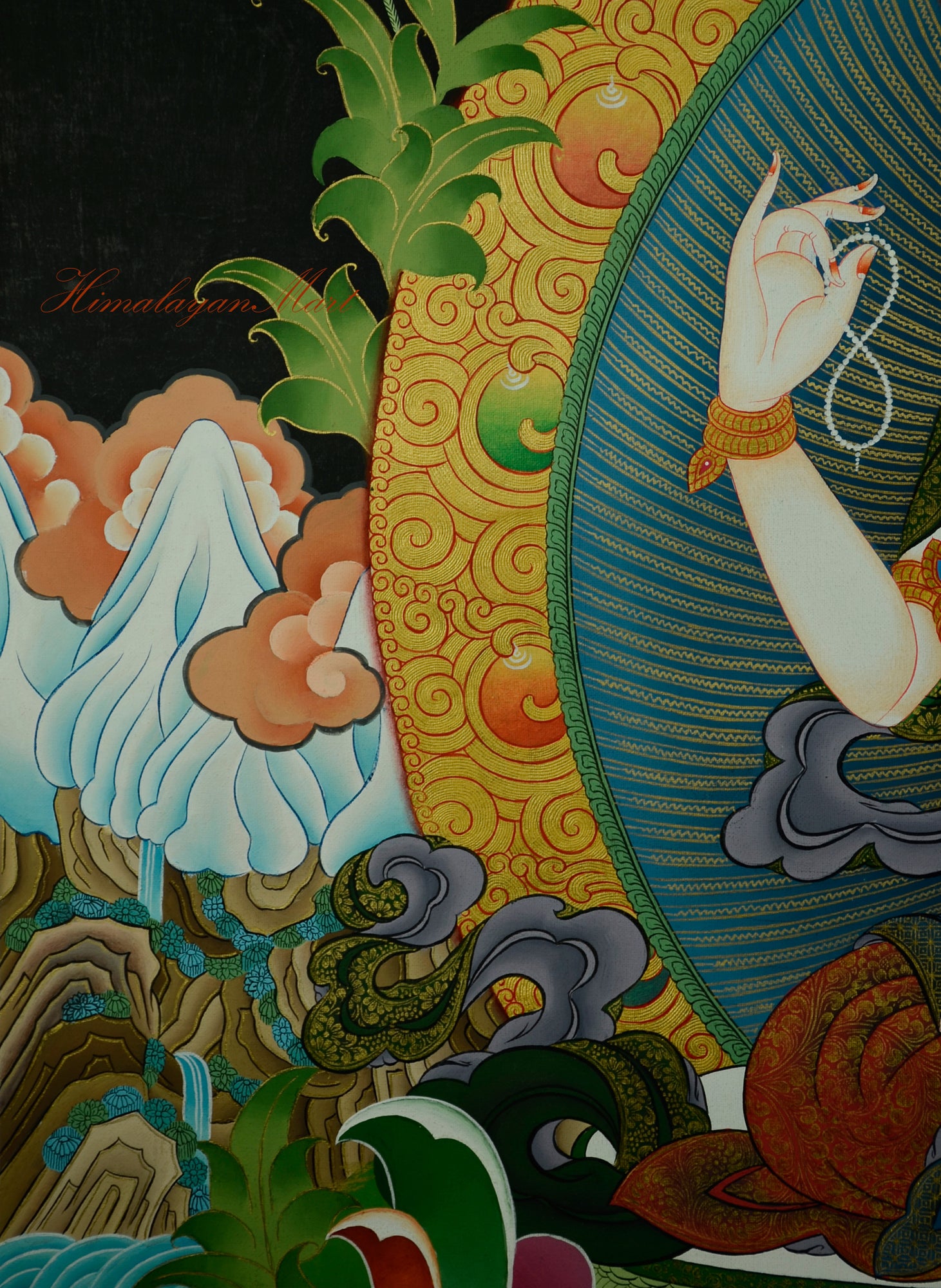 This Tibetan Four-Armed Chenrezig Thangka embodies the essence of compassion, serenity, and spiritual clarity. At the center of the painting, the Four-Armed Chenrezig sits in calm meditation atop a lotus-based throne resting on a lush green hill. He is adorned in richly detailed robes, radiating divine grace and inner peace. His lower pair of hands are held at the heart in Anjali Mudra, cradling a Cintamani, the wish-fulfilling jewel that symbolizes the union of wisdom and compassion. In his upper right hand, he holds a crystal mala, representing continuous compassion through the recitation of sacred mantras. His upper left hand gently supports a blooming lotus flower, signifying purity, spiritual awakening, and liberation from samsara.