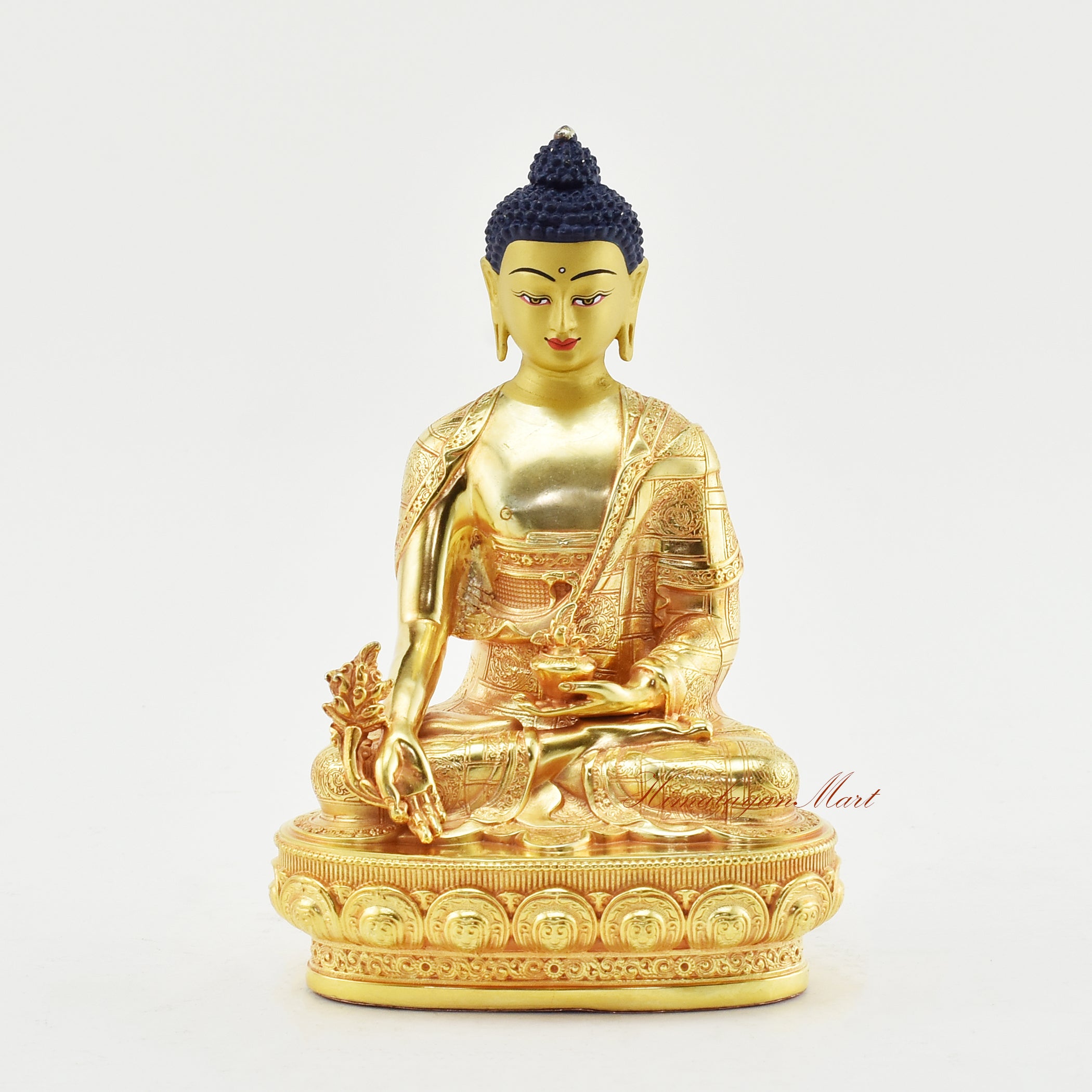 The Medicine Buddha (Bhaishajyaguru) represents healing and wellness. This finely crafted sculpture promotes spiritual and physical wellbeing. The lost wax casting guarantees durability and authenticity.