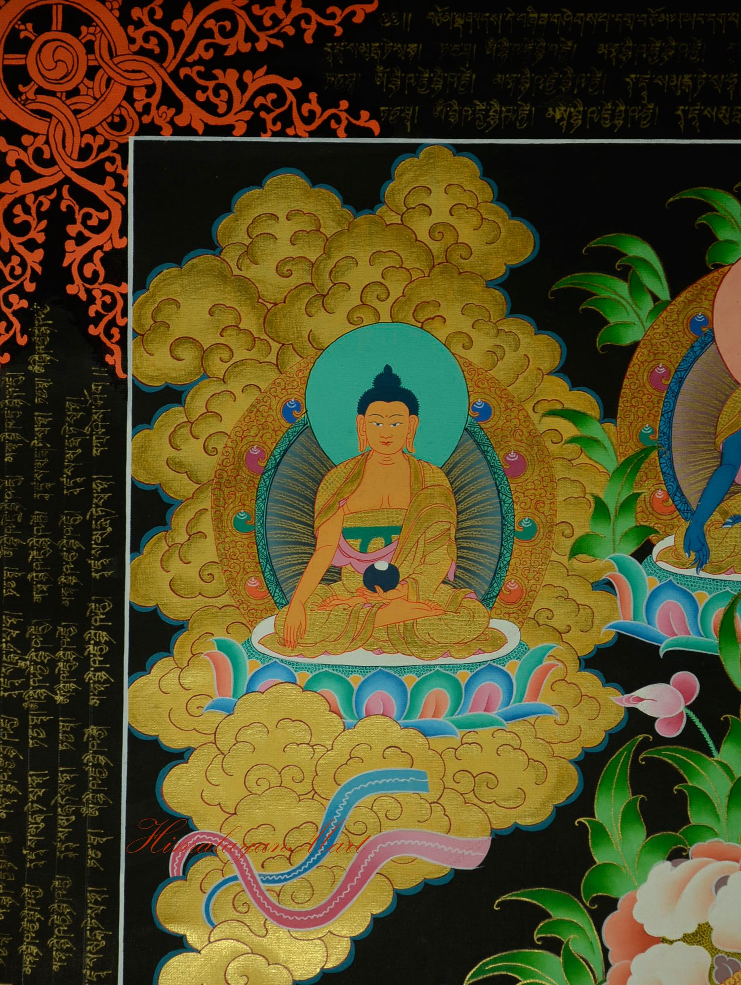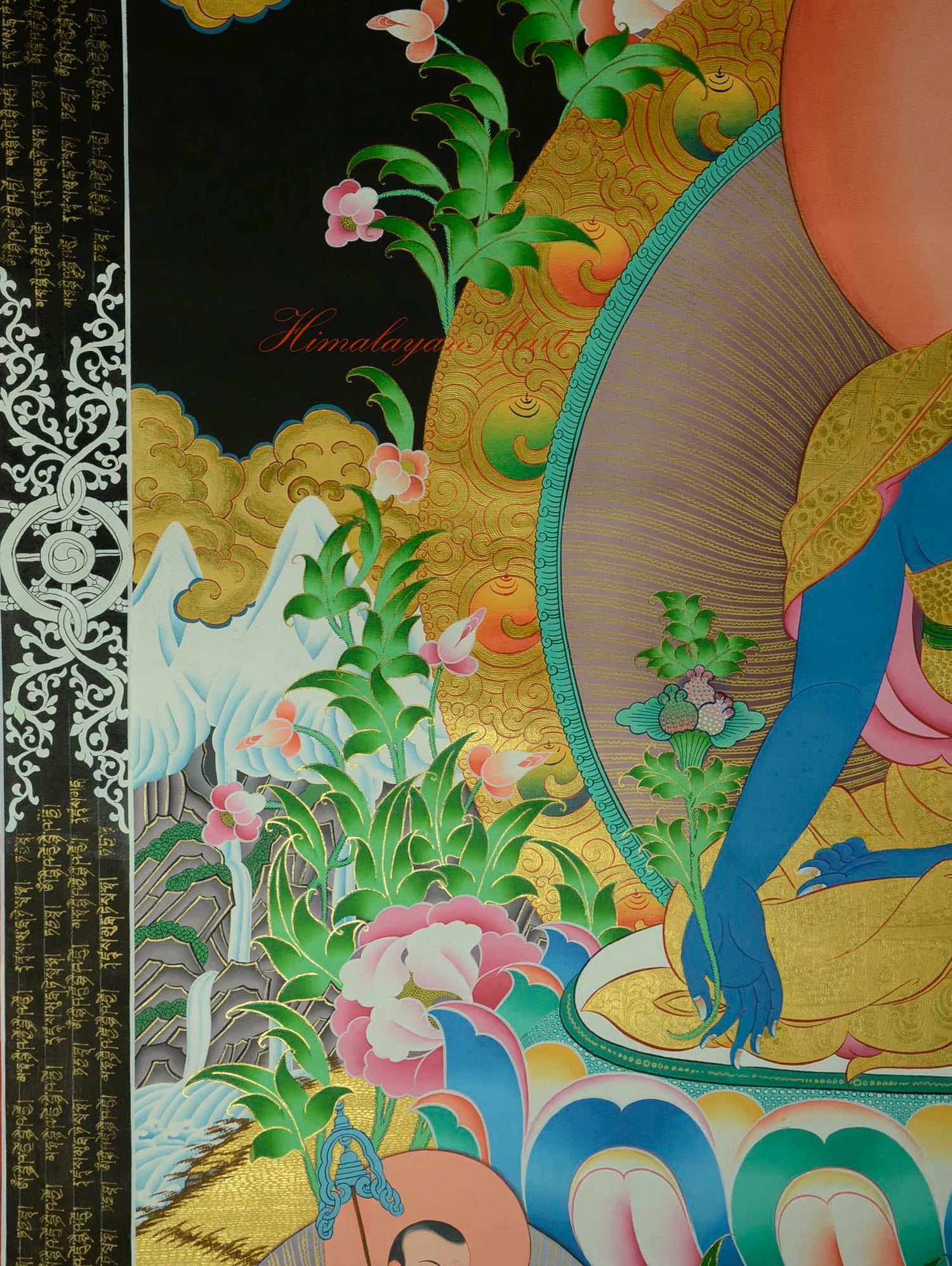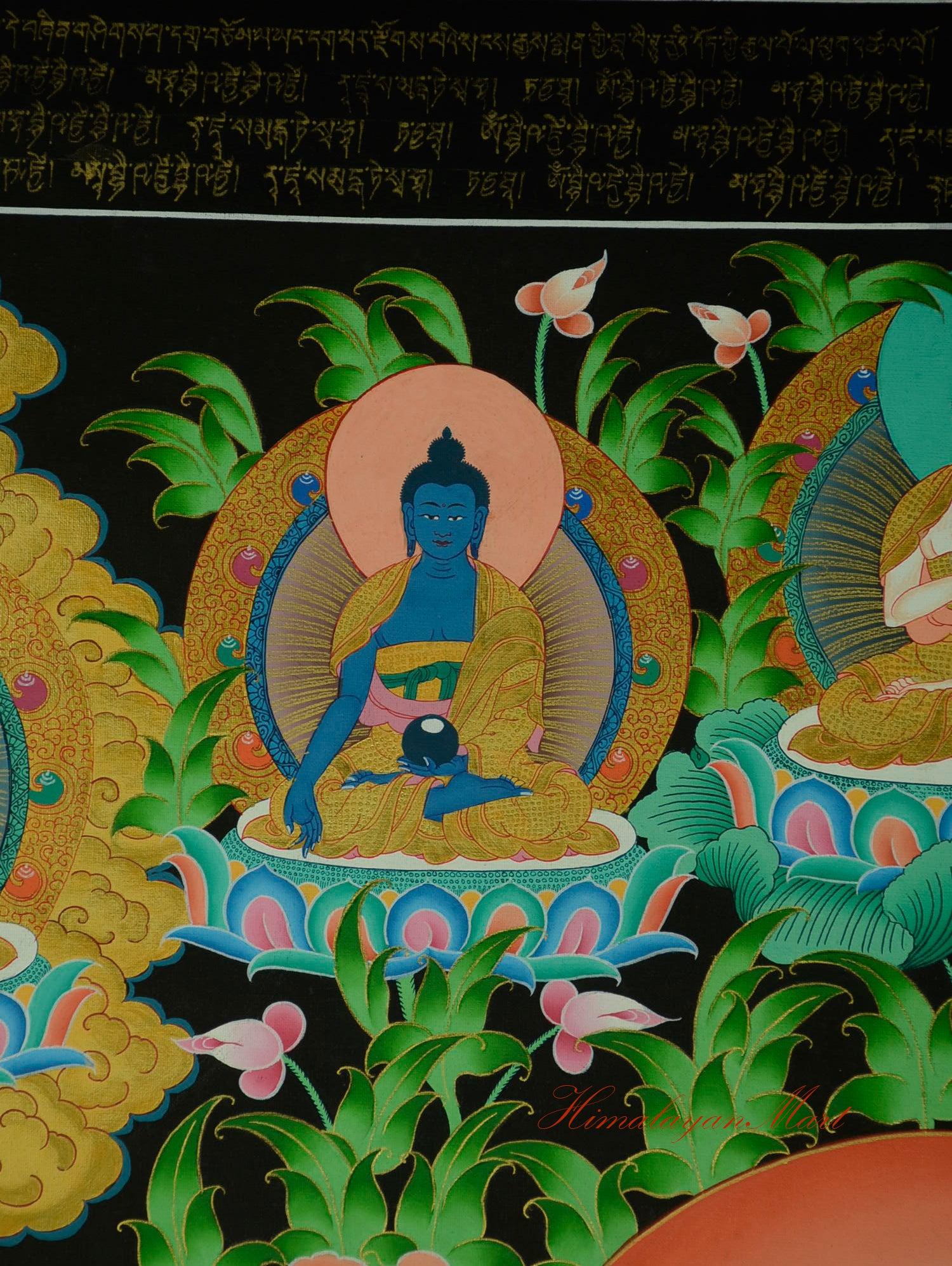 This Tibetan Medicine Buddha Thangka is beautifully hand-painted on high-quality cotton canvas. It uses vibrant acrylic paints, richly detailed with 24K gold accents. Created in the traditional Tibetan style with a striking black background, the thangka reflects deep spiritual devotion and skilled artistry.