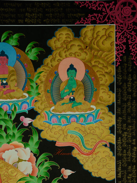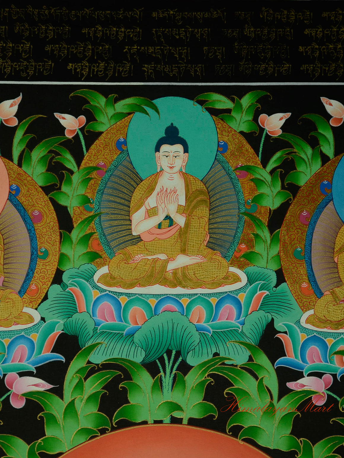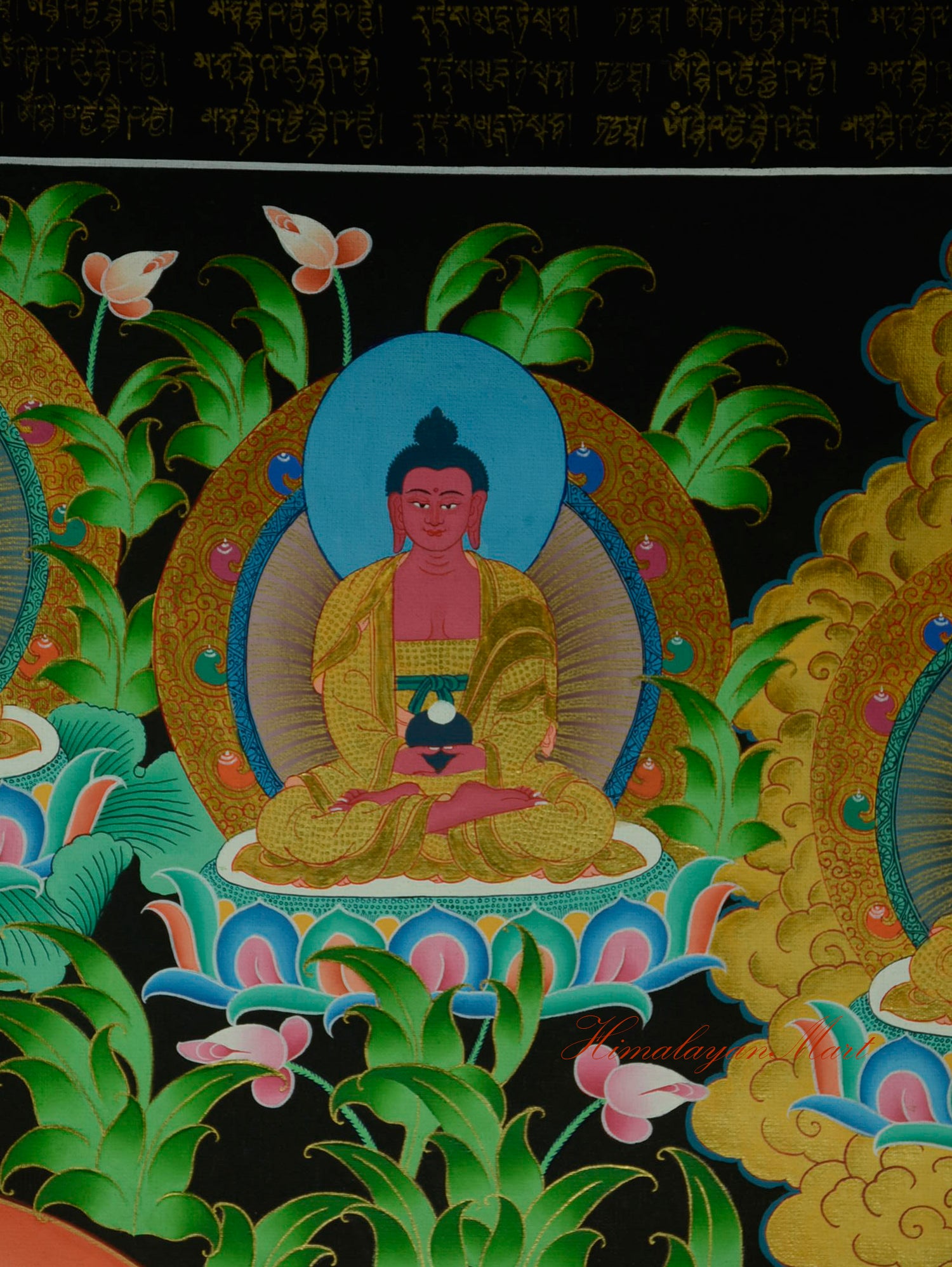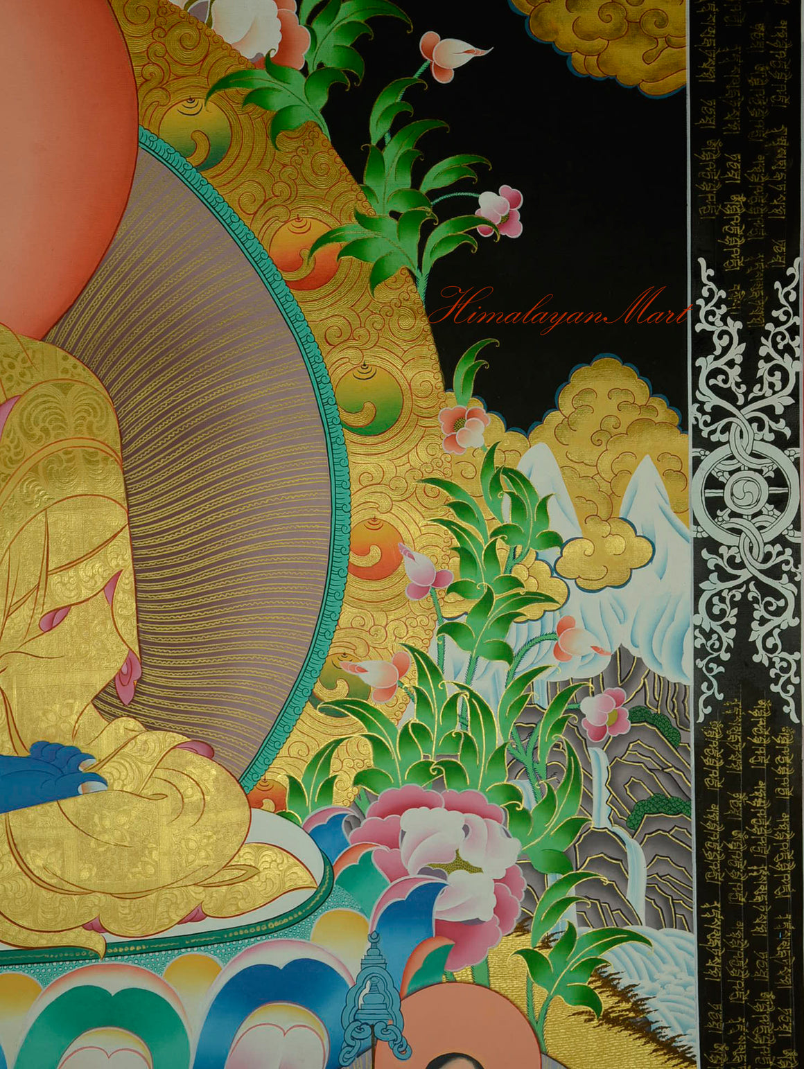 This Tibetan Medicine Buddha Thangka is beautifully hand-painted on high-quality cotton canvas. It uses vibrant acrylic paints, richly detailed with 24K gold accents. Created in the traditional Tibetan style with a striking black background, the thangka reflects deep spiritual devotion and skilled artistry.
