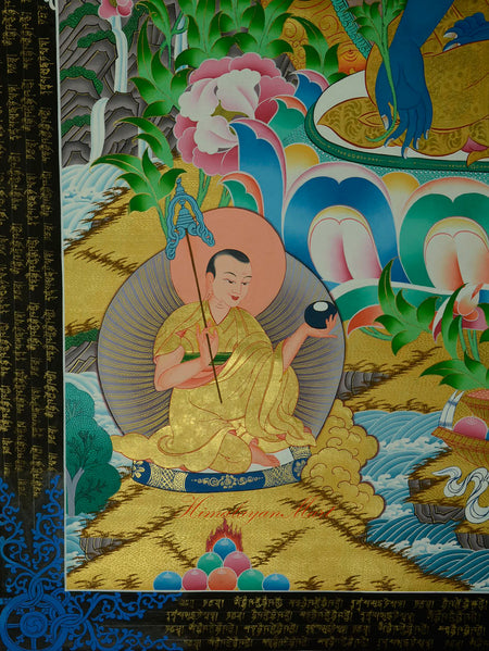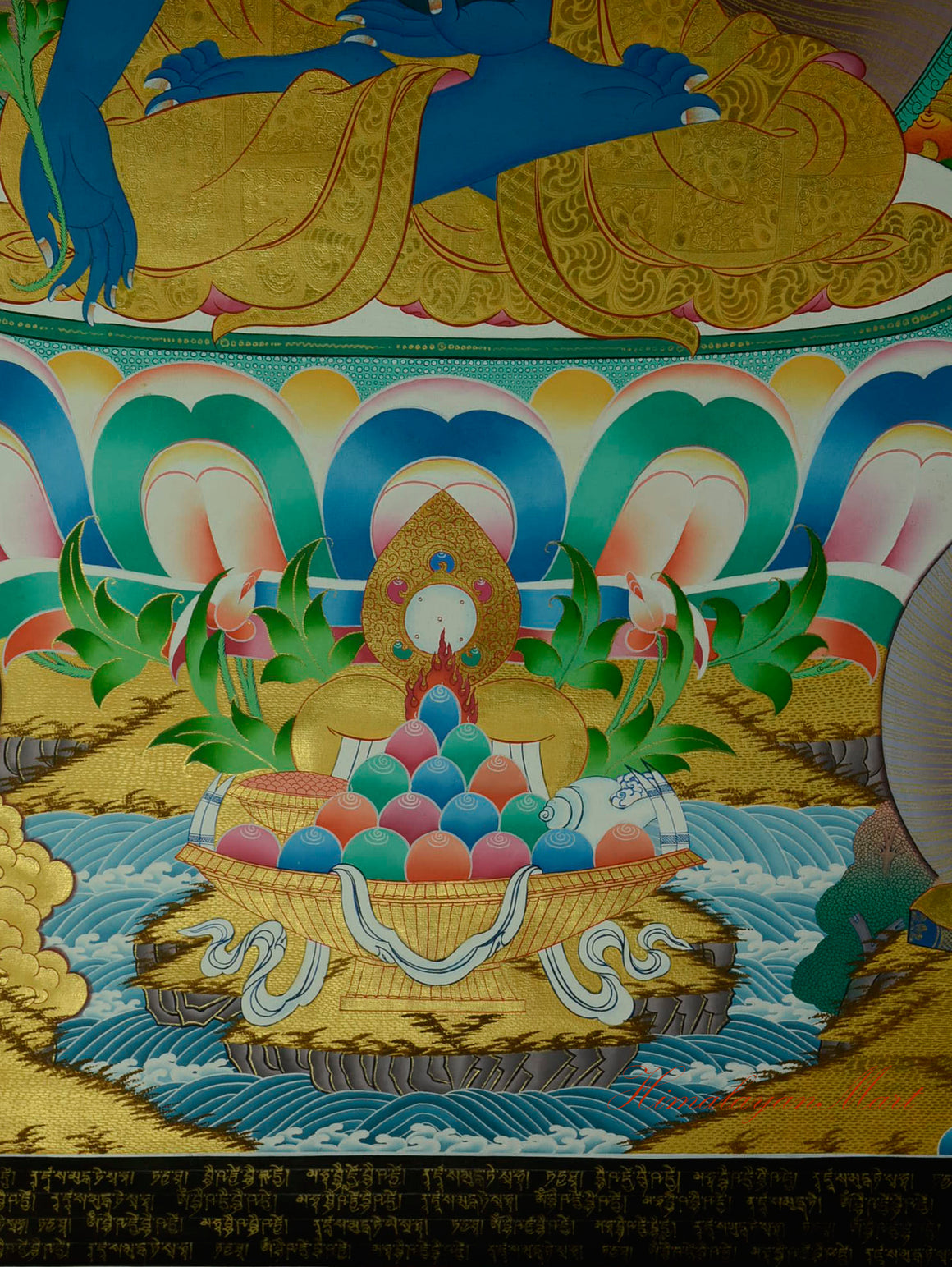 This exquisite Tibetan Medicine Buddha Thangka features Bhaisajyaguru, the Buddha of Healing, seated gracefully on a lotus throne. His right hand is in Varada Mudra, holding the sacred Myrobalan plant, a symbol of healing and compassion. His left hand, in Dhyana Mudra, holds a nectar bowl symbolizing inner peace, balance, and spiritual well-being.