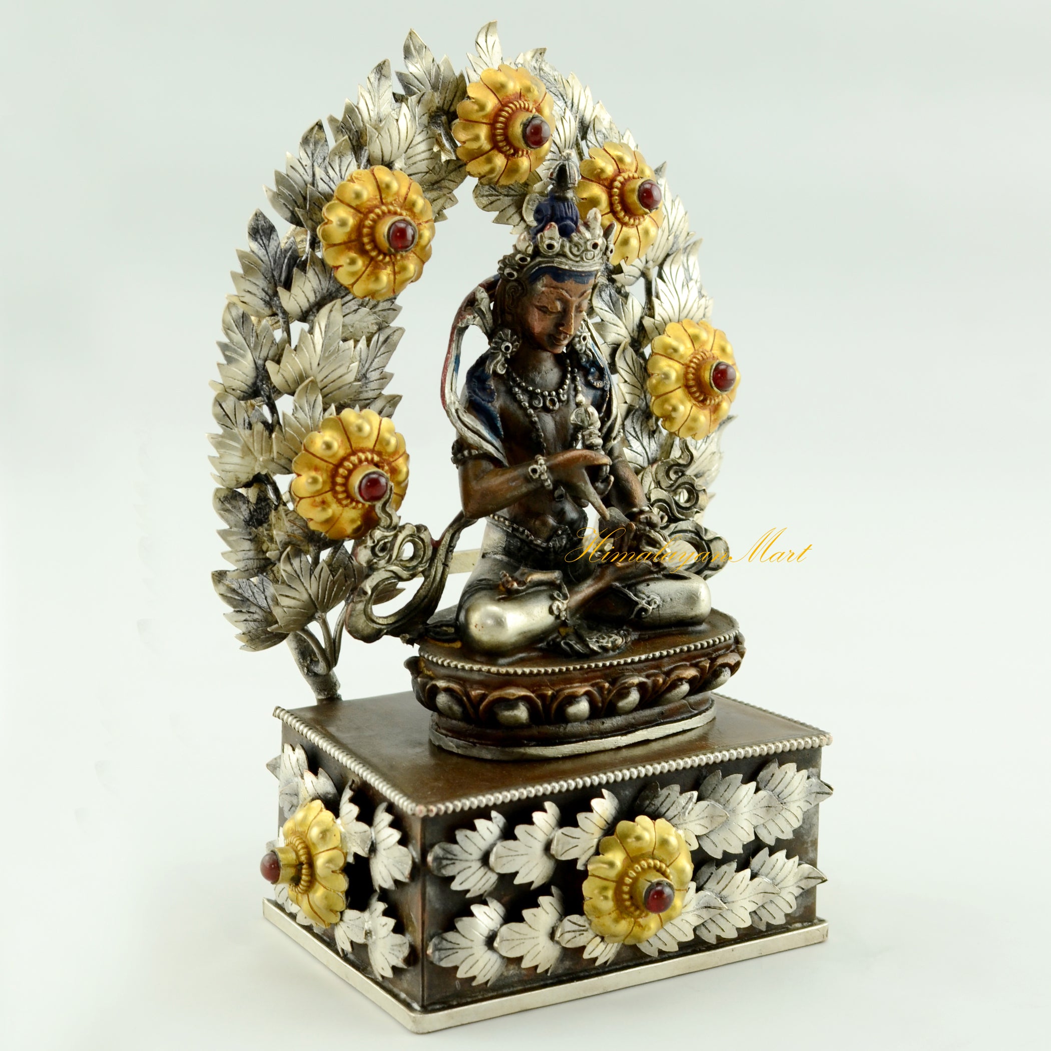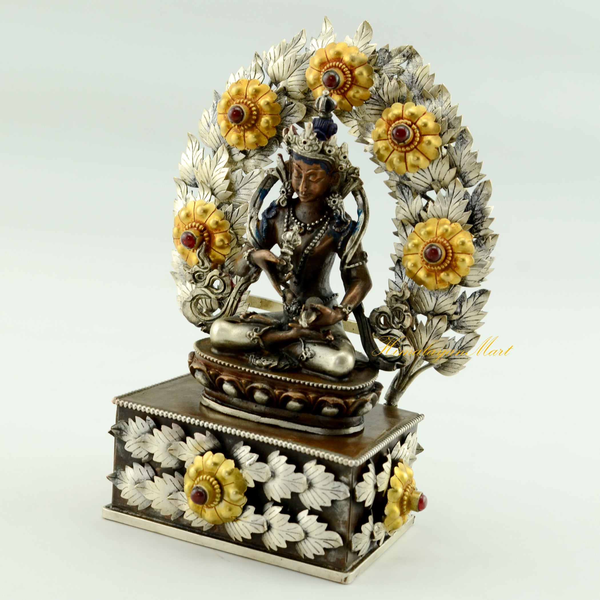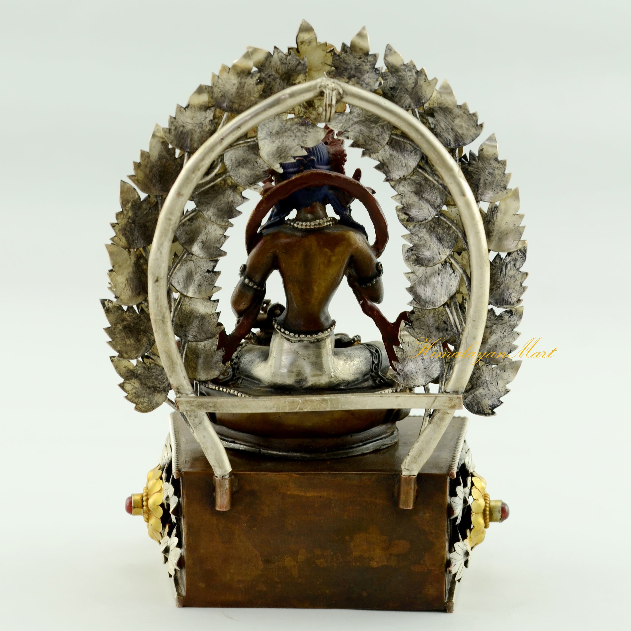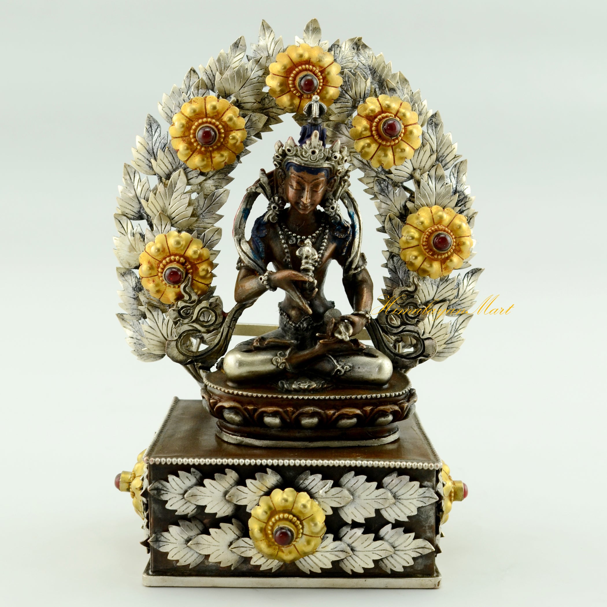 A beautifully detailed throne with floral and petal designs enhances its sacred presence. Gold and silver plating add a divine brilliance, symbolizing Vajrasattva’s enlightened essence. The oxidation finish gives an antique appearance, enriching its spiritual significance.