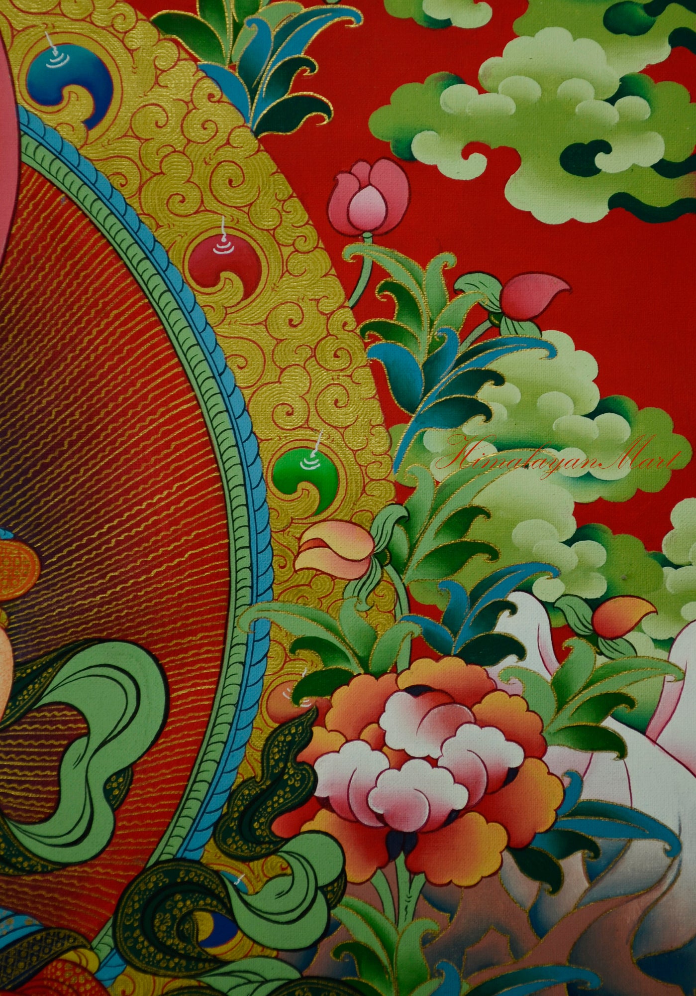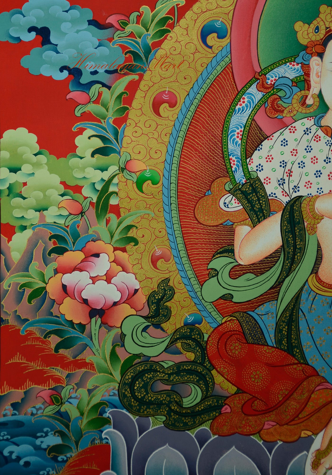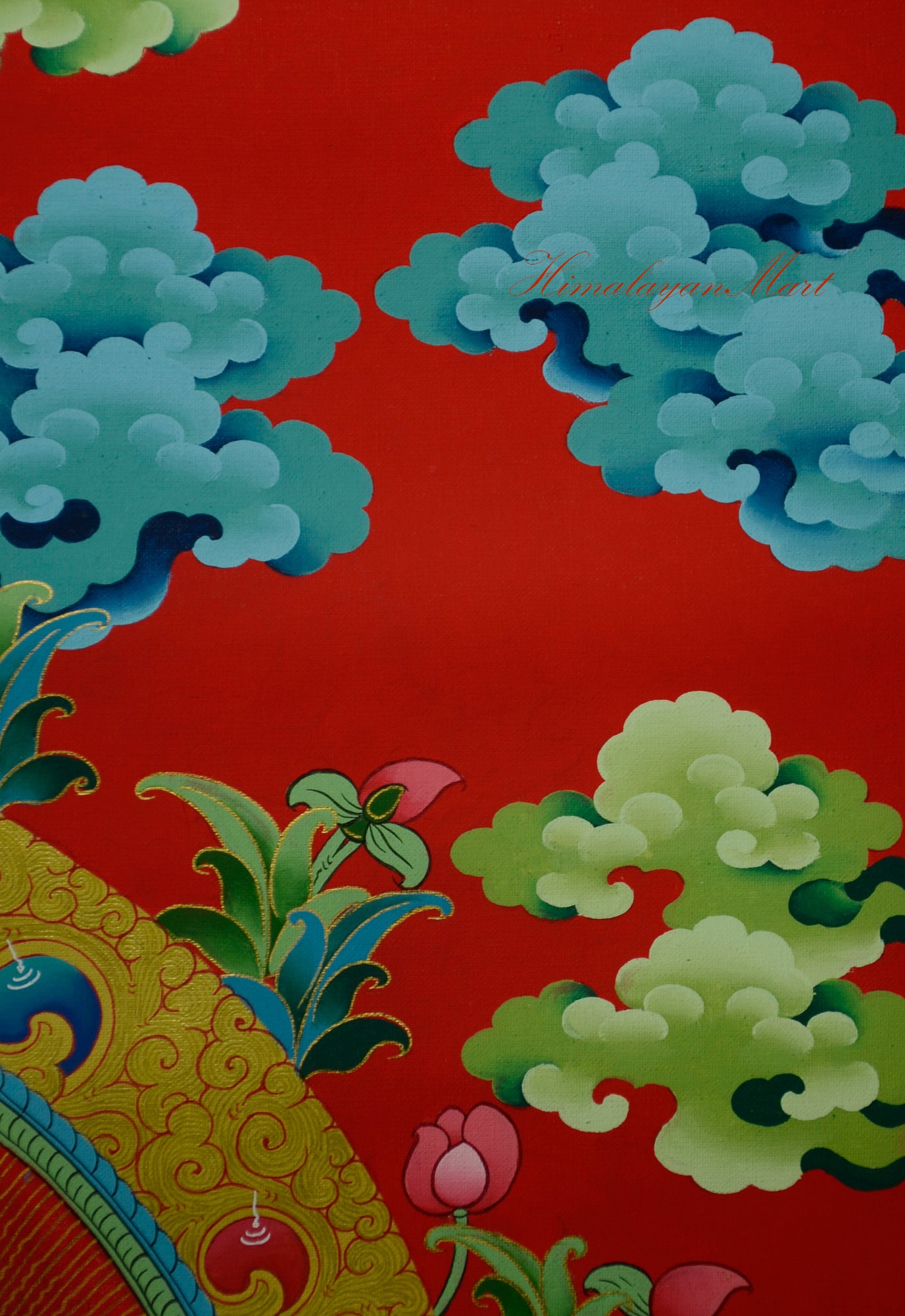 The intricate brushwork reflects deep spiritual intention and generations of artistic heritage. Each detail is rendered with precision to preserve sacred proportions and symbolism. Gold accents illuminate the thangka, radiating a soft, spiritual glow.
