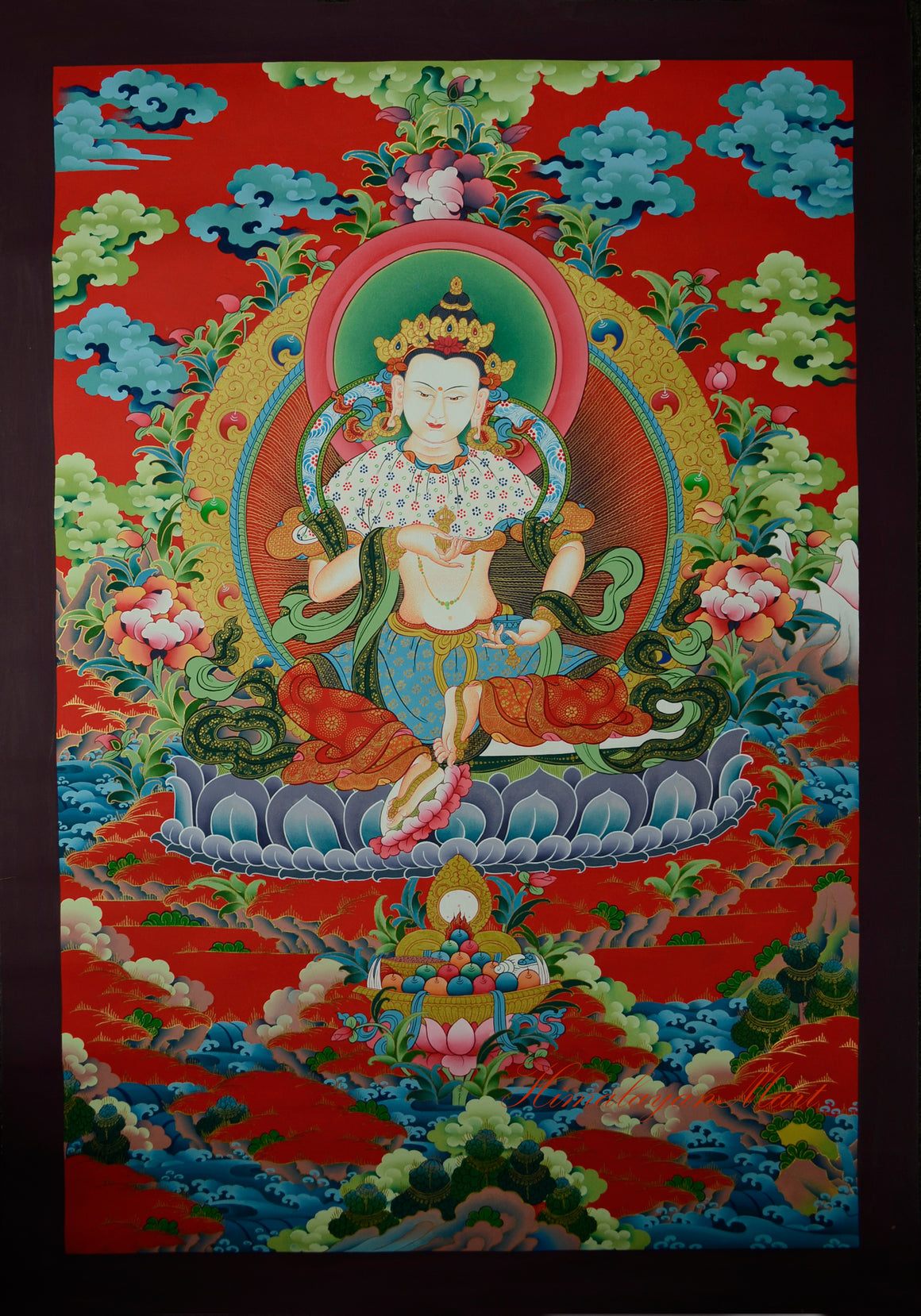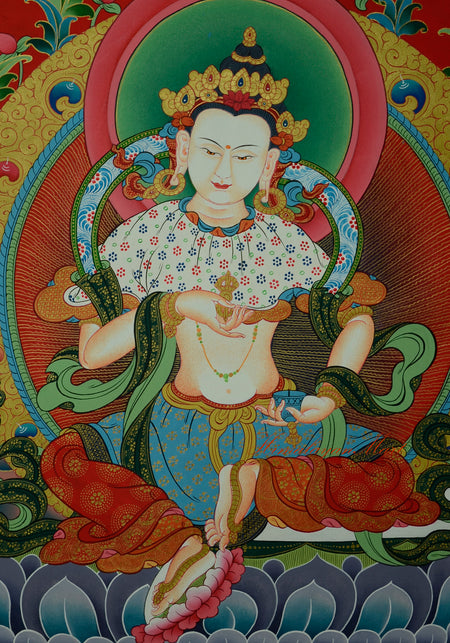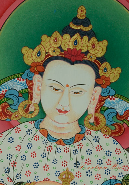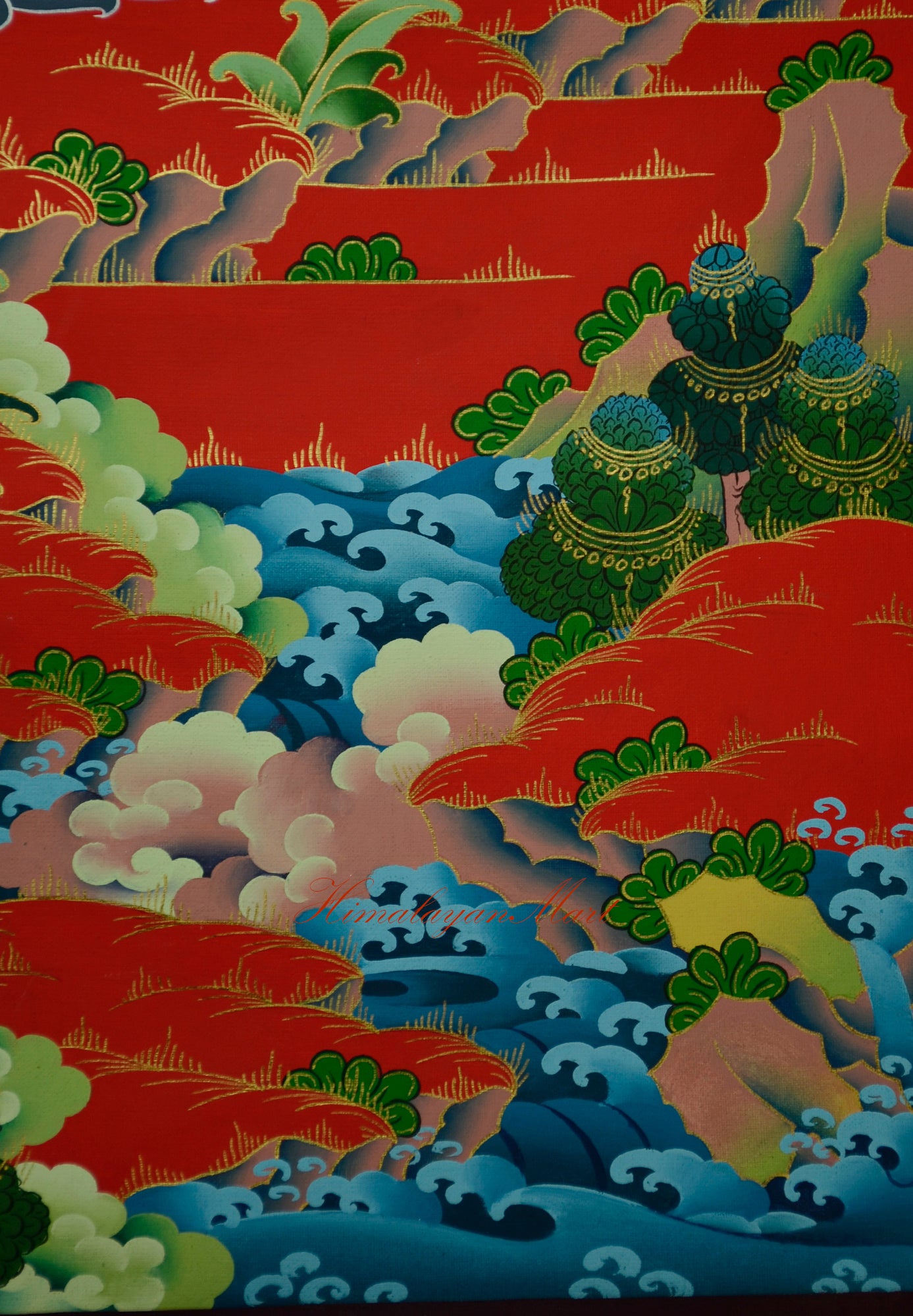 The intricate brushwork reflects deep spiritual intention and generations of artistic heritage. Each detail is rendered with precision to preserve sacred proportions and symbolism. Gold accents illuminate the thangka, radiating a soft, spiritual glow.