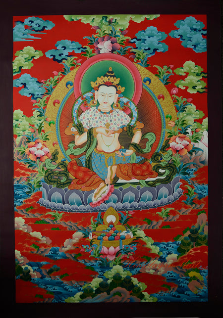 This exquisite Vajrasattva Thangka for Altar is a sacred artwork created in traditional Tibetan style. Carefully hand-painted on fine cotton canvas, this Vajrasattva Thangka for Altar features rich acrylic colors and 24-karat gold detailing. Vajrasattva, the manifestation of purity and spiritual purification, sits in calm composure at the center. In his right hand, he gracefully holds a vajra, symbolizing compassion, while his left hand cradles a bell, representing wisdom. These symbols represent compassion and wisdom, essential qualities in Vajrayana practice.