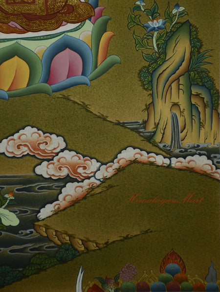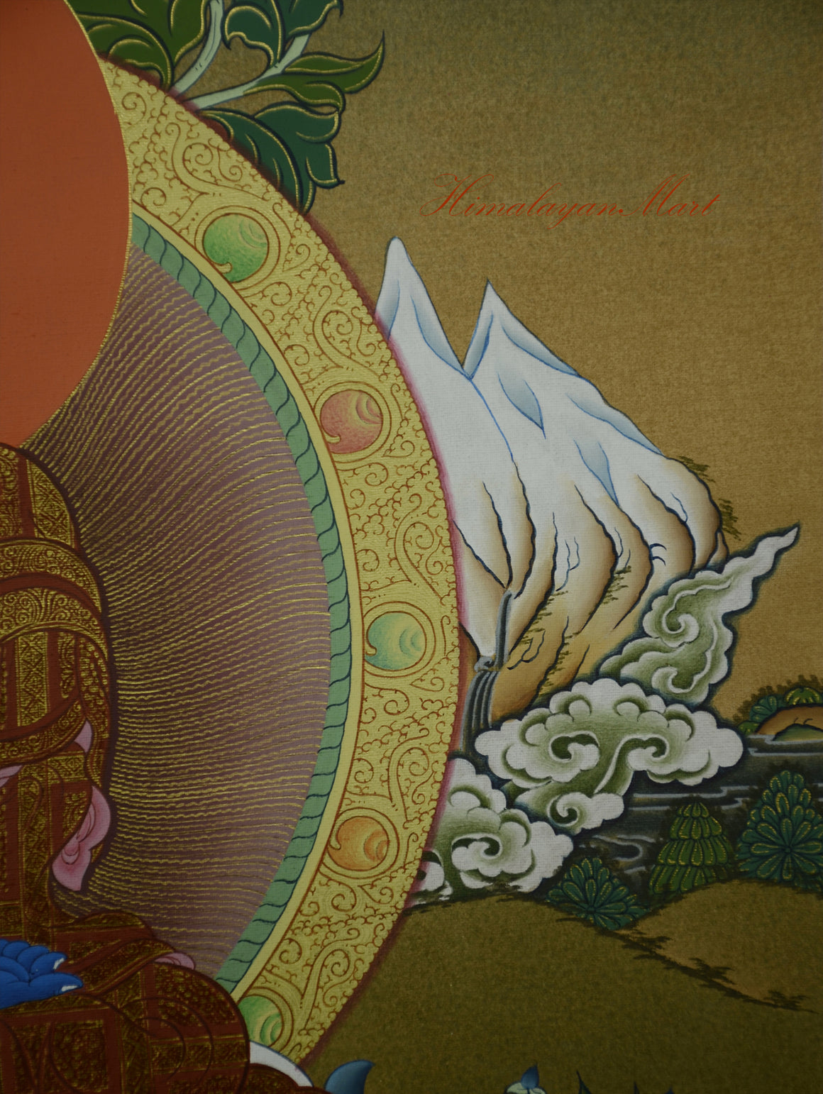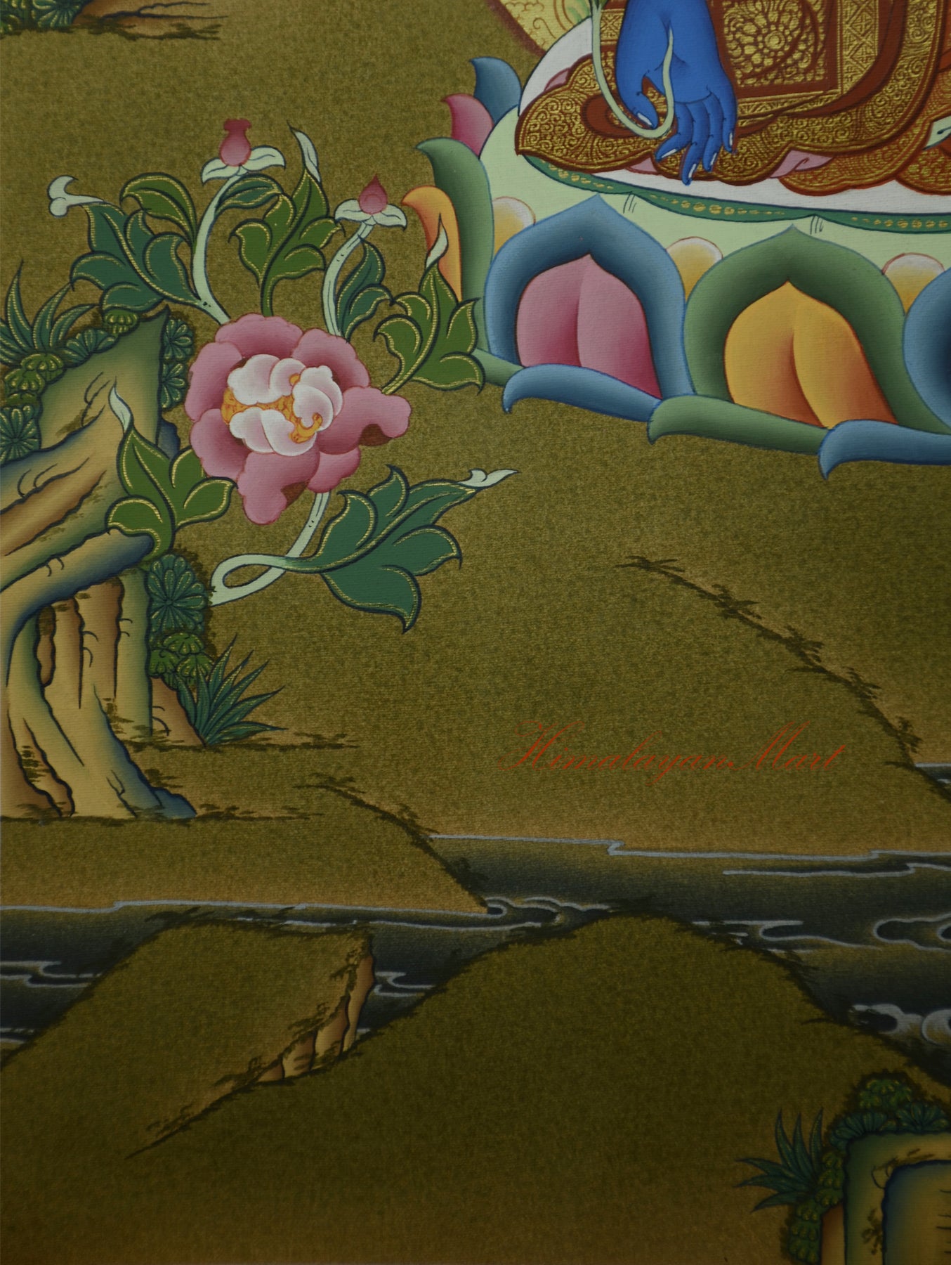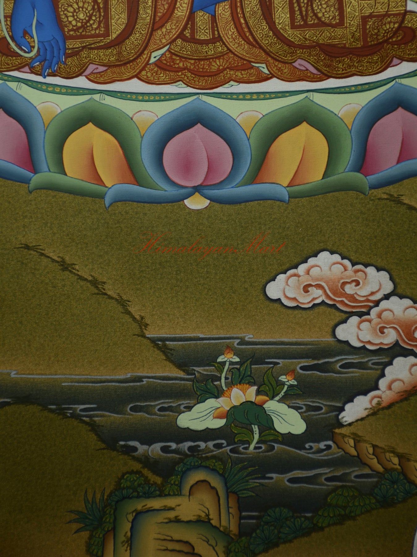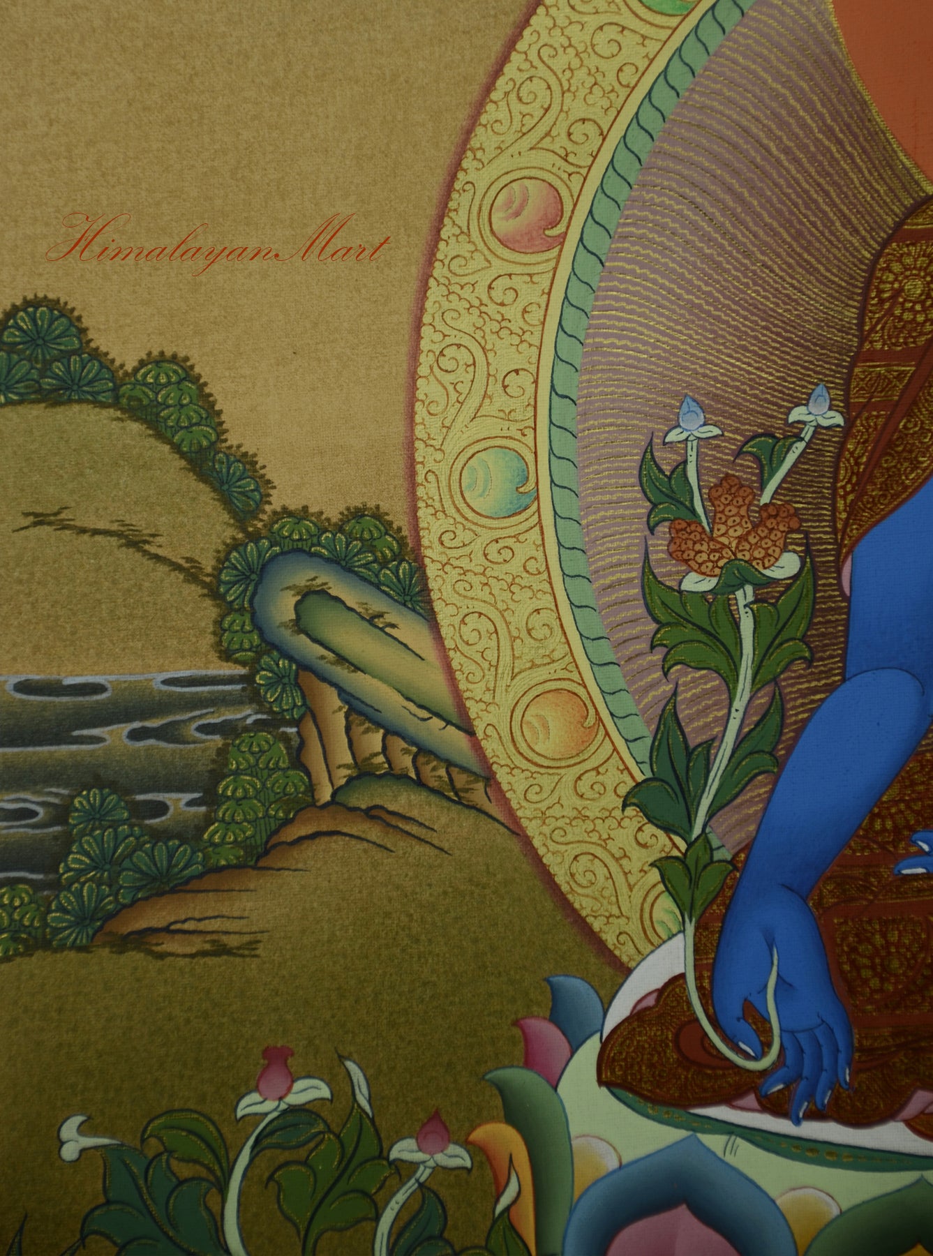 The Vajrayana Medicine Buddha Painting is a sacred Tibetan artwork symbolizing healing, wisdom, and compassion. Hand-painted on fine cotton canvas, it uses rich acrylic paints and 24 Karat Gold details. The painting features Bhaisajyaguru, the Medicine Buddha, seated in deep meditation holding a healing herb. His luminous blue body reflects the power of lapis lazuli and divine medicine. Each stroke follows traditional Tibetan techniques preserved by skilled Himalayan artisans. The composition includes sacred symbols that radiate peace, health, and spiritual energy. Ideal for meditation rooms, healing centers, or personal altars, this thangka supports mindfulness and inner transformation. Rooted in Vajrayana Buddhist tradition, it serves as a focus for prayer and Dharma practice. This painting offers more than beauty—it brings blessings and healing.