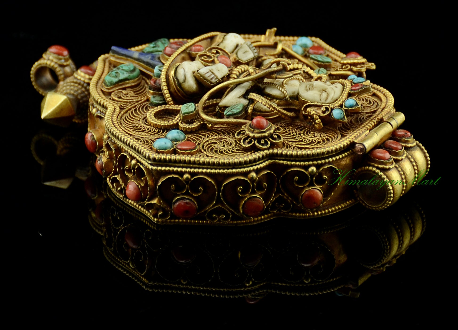 This White Tara & Chenrezig Pendant showcases the timeless beauty of Himalayan craftsmanship through its finely detailed siko filigree carving, an intricate metalwork style mastered over centuries. Every curve and lattice pattern has been shaped by hand, creating a delicate framework that highlights the pendant’s gold-plated finish. Turquoise, coral, shell, and lapis stones are inlaid with meticulous precision, adding vibrant color and symbolic meaning to the design. Their natural textures contrast beautifully with the polished metal, enhancing the pendant’s luminous, multidimensional appearance.